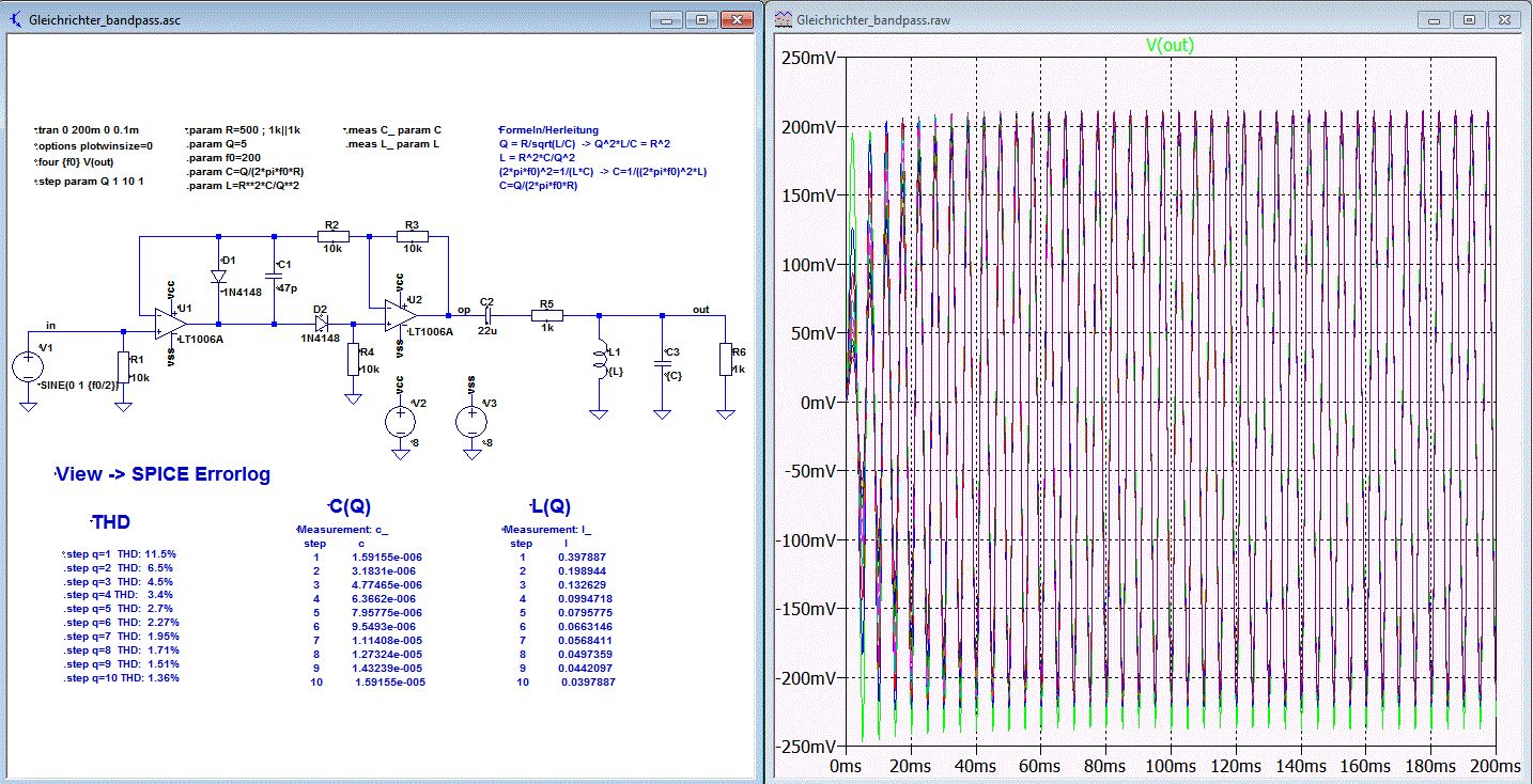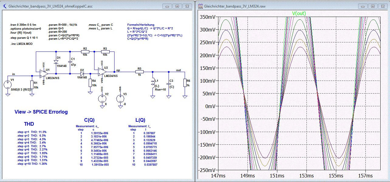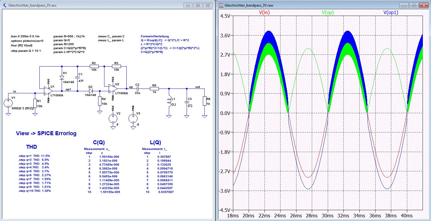Hallo, "Bei der Gleichrichtung sind auch unerwünschte Oberschwingungen aufgetreten, welche es gilt mittels eines Parallel Resonators, sprich Bandpass, rauszufiltern. Dieser muss nun dimensioniert werden" Also ich möchte Deine Aufgabe einmal umformulieren: Gegeben ist ein Eingangssignal mit fester Frequenz, die mit Hilfe der Zweiwegegleichrichtung verdoppelt werden soll. Hierzu kommt eine Schaltung mit Operationsverstärkern zum Einsatz. Mittels Resonator/Schwingkreis soll wieder ein einwandfreies Sinussignal am Ausgang entstehen. Das grüne Ausgangssignal sieht doch wie ein schöner Sinus aus. Wo sollen da unerwünschte Oberwellen sein? Das rote Signal ist einwandfrei das Ergebnis der Zweiwege-Gleichrichtung und enthält somit all diejenigen Oberwellen, die notwendig sind, um seine Kurvenform (insbesondere die Spitzen unten) entstehen zu lassen. Um nun aus dem oberwellenhaltigen Signal wieder einen sauberen Sinus entstehen zu lassen, benötigt man entweder eine Tiefpaßfilterung mit hinreichender Flankensteilheit oder eine Bandpaßfilterung, die leicht ein Schwingkreis ausreichender Güte ausüben kann. Der Schwingkreis wird auf der doppelten Eingangsfrequenz angeregt und schwingt mit seiner Eigenresonanz bei 200 Hz. Bei ausreichend loser Koppelung an das Ausgangssignal der Operationsverstärker erscheint am Schwingkreis ein nahezu einwandfreier Sinus mit der doppelten Frequenz des Eingangssignals. Der vorgegebende Widerstand reduziert die Güte des Schwingkreises kräftig. mit freundlichem Gruß
