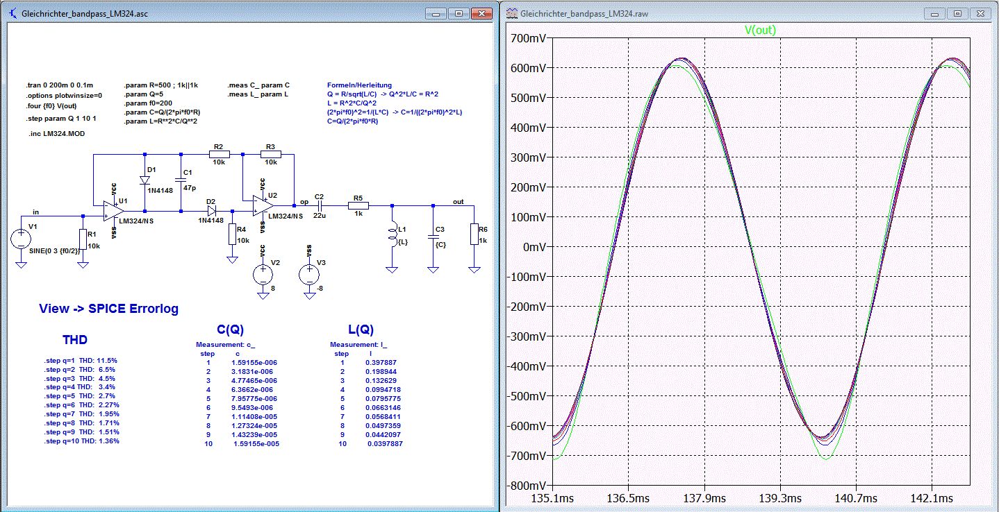 Hallo, in meiner Schaltung kann man auf den Serienkondebsator am Ausgang verzichten. Den gab es in der Originalschaltung ja auch nicht. Allerdings erhält man dann am Banpass ca. 10mV Gleichspannungsoffset, wenn man annimmt, dass die Spule einen Serienwiderstand von 10Ohm hat. Nachtrag: Mir ist gerade aufgefallen, dass auf Grund des angenommenen Serienwiderstandes die Amplitude der Ausgangsspannung mit steigendem Q bereits deutlich sinkt. Man sollte deshalb auf eine Spule mit kleinerem (<10Ohm)Serienwiderstand achten. Gruß Helmut