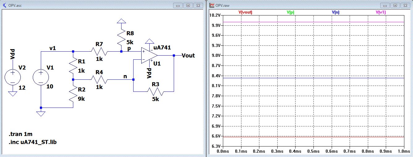Hallo, Ich stehe glaube ich gerade einfach auf dem Schlauch. Arbeite schon seit 1h an dem Problem. Nach meiner Berechnung müsste ich am Ausgang (10V-9V) * 5k/1k = 5V sehen. Warum ist das nicht der Fall sondern ich sehe den minimalen Spannungsoutput des OPVs? Habe auch schon die Parameter nach belieben geändert und es ändert sich nichts. Versorgungsspannung des OPVs ist doch auch okay, oder? Danke und Grüße