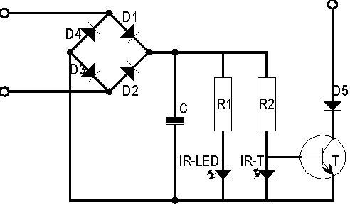 Aufgabenstellung: 1. Bau einer Lichtschranke 2. Zählen mittels (MEXLE 8252-Board) der Umdrehungen eines Rades welches durch die Schranke läuft. 3. Übertrag auf einen anderen Chip (MEXLE ATMEGA????????-Board) Zu1 Schaltplan Lichtschranke mit Forotransistor 1. Lichtschranke 2. Scheibe 3. Motor Oder Infarot Über die Dioden D1-D4 (1N4148) in der Schaltung wird die Lichtschranke mit Strom versorgt. Der Kondensator C (10 µF) ist als Glättungskondensator eingefügt, um minimale Schwankungen im Digitalstrom auszugleichen. Über R1 (1 kOhm) wird zunächst die IR-LED (IRL80A / IRL81A) betrieben, die die eine Hälfte der Lichtschranke darstellt. R2 (120 kOhm) bildet zusammen mit dem IR-Transistor IR-T (LPT80A) einen Spannungsteiler. Über D5 (1N4148) wird das Mexle-Board angeschlossen. Dieser Ausgang kann vom Transistor T (BC337-40) auf negatives Potential geschaltet werden. Fällt kein Infrarotlicht auf IR-T, wird die Basis von T über R2 auf positives Potential gezogen, T leitet. Wenn IR-T leitet, weil die Lichtschranke nicht unterbrochen ist, wird die Basis auf negatives Potential gezogen und T leitet nicht. Bauteil Bezeichnung D1-D5 Universal-Diode 75 V 100 mA DO35 R1 Widerstand 1kOhm R2 Widerstand 120kOhm C Elko 10 µF ø 5x11mm Elko 22 µF ø 5x11 mm T Transistor npn BC337-40 IR-LED Infrarot-Diode IRL80A Infrarot-Diode IRL81A IR-T Fototransistor LPT80A