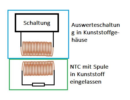Hallo, ich suche gerade eine Möglichkeit, einen Temperatursensor auszulesen, der in einer Kunststoffwand eingelassen ist. Die Auswerteschaltung sitzt in einem Gehäuse, dass Wasserdicht sein soll. Dieses wird erst nachträglich an der Kunststoffwand befestigt. Folgende Möglichkeiten gingen mir durch den Kopf: 1) Schleifkontakte nach außen führen: Hat den Nachteil, dass Undichtigkeiten entstehen können und die Kontakte wieder zusätzlich geschützt werden müssen 2) Induktive Kopplung: a)Entweder den Strom messen, der durch den NTC beeinflusst wird, oder.. b)die Schaltung als Schwingkeis ausbilden und dann die Verstimmung messen Schön wäre hier, wenn die Induktivitäten schon als Leiterbahn auf einer Platine ausgebildet wären. Oder gibt es da noch viel elegantere Lösungen? Ich habe mal noch ein Bild angehängt, hoffe ihr wisst was ich meine. Gruß