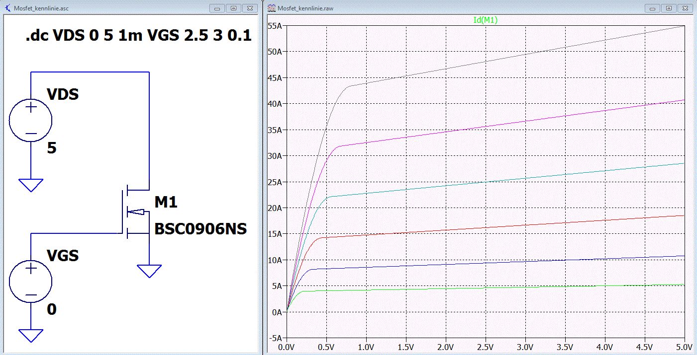 Schau die die Grafik Nr. 7 im Datenblatt an. Die bekommst du mit der von mir gezeigten Simulation. http://www.infineon.com/dgdl/Infineon-BSC120N03MSG-DS-v02_01-en.pdf?fileId=db3a304313d846880113de761b1d03a5 Noch ein paar Tipps. 1. Du solltest LTspice dazu bewegen in deiner Simulation mehr Punkte zu berechnen. 2. Den Widerstand in der Drainzuleitung solltest du wegnehmen damit du die gebräuchlichen Kennlinien bekommst.