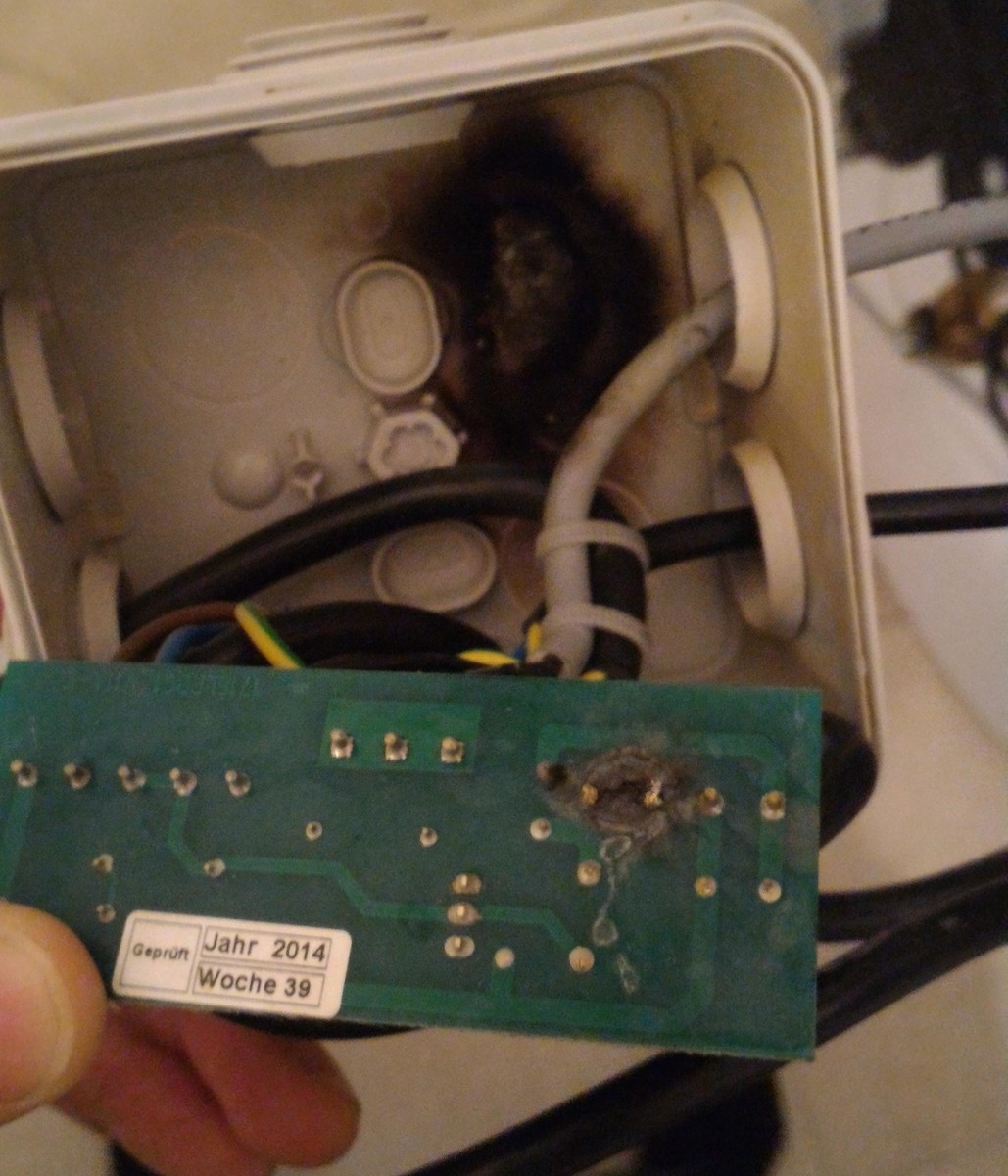 Ach so, die vier Pins in Reihe sind die Klemme. Na gut, dann halt so Ähnlich. Letztendlich hat es irgendwie die Lötstellen vorgeschädigt (Zugbelastung, schlechte Lötstelle, was weiß ich..) Das sieht meine Meinung nach wie eine langsame Zerstörung durch Erwärmung und verkokeln aus. Bei einem Überschlag hast Du einen leitfahigen Strompfad. Der wird dann auch von der Netzspannung genutz und sieht typischerweise anders aus. Da ist dann meistens metallischer Niederschlag des verdampften Kupfers zu erkennen. Ich würde also bei meiner Grundthese bleiben. Erwärmung der Lötstelle bis es zum verkohlen gekommen ist. Das ist dann Leitfähig und kokelt von alleine unter Spannung. ---- Prometheus