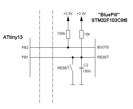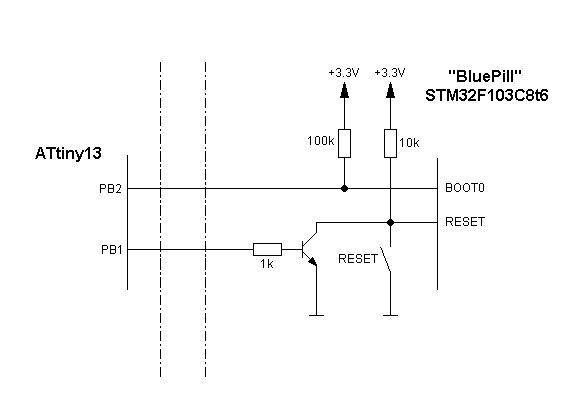 Ich habe ein (für mich) etwas merkwürdiges Problem: Ich möchte mir ein eigenes Dev-Board auf Basis des auf Ebay ( http://www.ebay.de/itm/STM32F103C8T6-STM32-Minimum-System-Development-Board-Module-For-Arduino-TE435-/272283008473?hash=item3f6554fdd9:g:GTAAAOSwMNxXazXE ) massenhaft verkauften BluePill Boards STM32F103C8T6 entwickeln. Dieses Board möchte ich NICHT mittels ST-Link flashen, sondern ich möchten den integrierten seriellen Bootloaders des STM32 nutzen. Nun ist das mit der BluePill eine ziemliche Frickelei: Boot0 Jumper auf 1 stecken, Reset druecken, mittels STM32flash Programm flashen, Boot0 Jumper zurück auf 0, Reset drücken. Das wollte ich eleganter machen und dachte mir: Okay, das kann auch der billigste / kleinste ATtiny, ich drücke eine Taste und lasse diese Abfolge generieren, eine LED zeigt mir an, dass ich Bootloader aktiviert habe, Programm übertragen, Taste noch einmal drücken fertig. Eigentlich ist das Programm für den Tiny ein Witz (so dachte ich jedenfalls), Pustekuchen !!!! Die Abfolge mit dem Tiny zu generieren ist einfach und ich habe das auch schon oszilloskopiert. Einzig es funktioniert nicht !!!! Wenn der Tiny (wie im Schaltbildausschnitt) den BOOT0 aktiviert, und ich den Reset auf dem BluePill drücke, bin ich im Bootloadermodus und ich kann ein Programm flashen. Lasse ich den Resetimpuls mittels des Tiny generieren funktioniert das nicht ! Dann habe ich mir das Schaltbild der Bluepill angesehen und festgestellt, es ist ein Kondensator am Resetpin gegen Masse verschaltet: 100nF ! Okay, dachte ich mir, den entfernst du... geht aber dennoch nicht. Resetimpuls bis zu einer Sekunde verlängert ... geht nicht. Resetimpuls invertiert ausgegeben und über einen Schalttransistor (BC549 und auch mittels eines FET BS170) versucht den Resetpin auf 0 zu ziehen ... geht nicht !!!! Ich guck mir das auf dem Speicherscope an. Resetleitung wird satt auf 0 und auch satt wieder auf 3,3V gesetzt. Geht aber dennoch nicht ! Kann sich das jemand erklären ? Dann, mit dem "Spielen" fällt mir etwas auf (serieller Chip ist ein CH340G): Wenn ich ein serielles Programm geflasht habe, ein Terminalprogramm offen habe (DTR und RTS sind nicht aufgelegt) ... und ich aktiviere am Tiny den Bootloadermodus... ich beendet das Terminalprogramm.... dann ist die Bluepill tatsächlich im Bootloadermodus und ich kann den STM32 flashen. Ansonsten (ohne Aufruf des Terminalprogramms) muß ich, nachdem der Tiny Boot0 auf 1 gelegt hat, den Reset von Hand über den Resettaster der Bluepill aktivieren. Ich habe keine Ahnung, woran das liegt ! (in meinen Versuchen habe ich sogar versucht, den Reset mittels eines Relais zu aktivieren, das klappt dann witzigerweise). Die Transistorstufe, die den Reset betätigt hat einen Basisvorwiderstand von 1 kOhm. Kollektor an Resetleitung, Emitter an Masse. Bei Verwendung des FET's am Gate 1 MOhm gegen Masse, Drain an der Resetleitung, Source an Masse.
