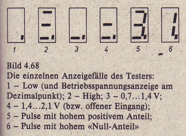 Mir hat die Logicprobe im Außen-Kundendienst oft geholfen, auch wenn ein Scope noch im Auto war. Ab den 70ern gab es in Industriegeräten viele gesockelte CPUs, PIAs, ROM, RAM usw., zum Teil verstreut auf verschiedenen Platinen. Das war bei 4MHz Clock auch noch möglich. Der Vorteil der Probe ist, daß man beim Kontaktieren nicht wie beim Scope hochschauen muß und dabei evtl. abrutscht. Der Trick dazu war, unter die CPU einen zusätzlichen Sockel zu stecken, bei dem NOP (no operation) fest verdrahtet war. Damit zählte die CPU 1 Adresse höher und zählte so zyklisch weiter. Auf allen Adress- und Datenleitungen war somit allerhand los, was man mit der Probe schnell nachvollziehen konnte. Auf diese Weise konnte man Unterbrechung oder Schluß sofort erkennen. Fehlerhafte Bauteile oder Verbindungen konnte man lokalisieren und reparieren. Heute geht das fast nicht mehr, es ist sowieso Modulersatz gewünscht... Gruß - Werner