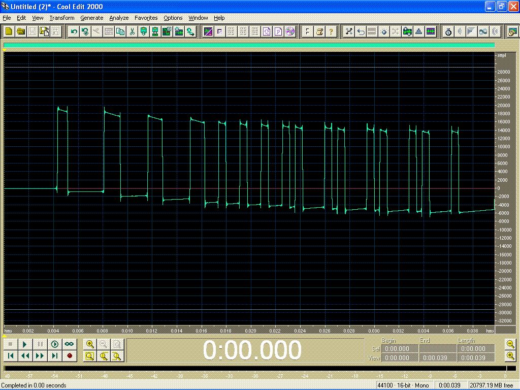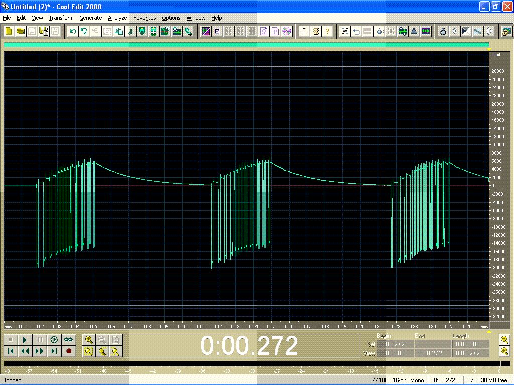 Ich hatte hier noch eine alte Grundig-Fernbedienung von einem Videorekorder rumliegen (RP35). Da habe ich jetzt mal die Programm Taste 1 gedrückt und dann kommen das hier in CoolEdit an. Im Bild sieht man, daß er bei einmal drücken den Code 3x schickt.