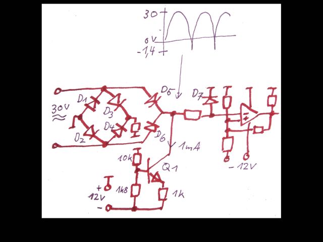 Hi, ob meine Schaltung so funktionieren wird? Ich brauchte eine Nulldurchgangserkennung auf der sekundär Seite eines Trafos. Vorhanden ist eine Trafowicklung, an der eine Gleichrichterbrücke angeschlossen ist und eine -12 Volt Spannung. Ich will eine Diodenhalbbrücke verwenden, in der ein Konstantstrom aus der – 12 V eingespeist wird. Der Nulldurchgang liegt dadurch auf – 1,4 Volt und kann mit einem Komparator ausgewertet werden. Was ich nicht weiß, ob es ein Problem ist, dass beim Nulldurchgang die Dioden D1 und D2 gleichzeitig leitend sind. Nach dem Nulldurchgang fließt dann kurzzeitig ein kleiner Querstrom bis D3 oder D4 leitet. Grüße