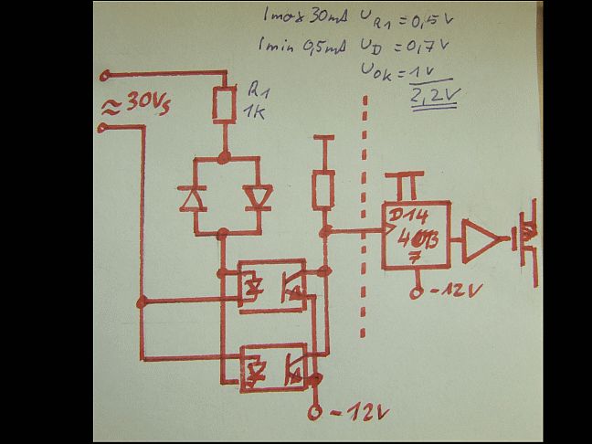 Die vorgeschalteten antiparallelen Dioden können weggelassen werden, damit die Triggerschwelle (lt. ArnoR) noch niedriger wird. Die beiden LEDs im Optokoppler schützen sich (lt. Mampf F.) gegenseitig vor der Reverse-Voltage.