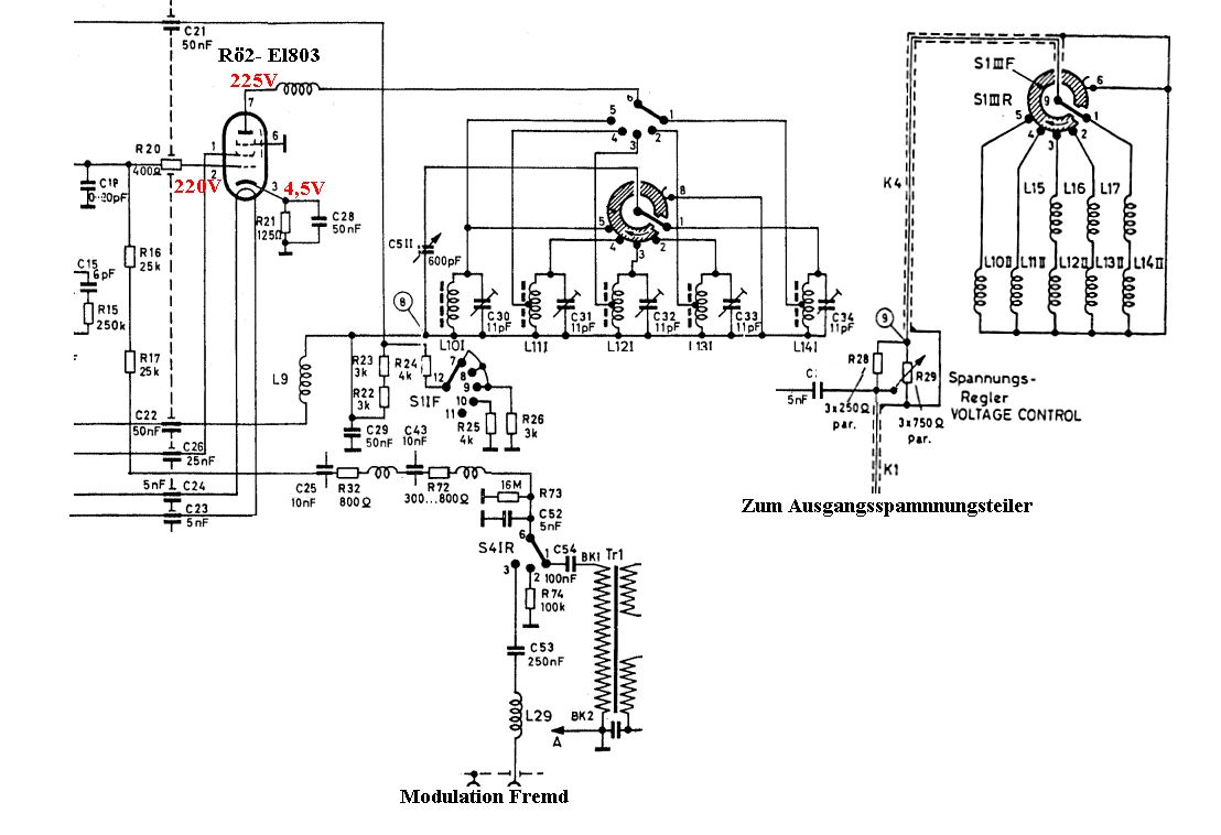Die Anteuerung ist schon recht stark- immerhin dudelt vor der Endstufe nur 1 Oszillatorröhre,auch hier hat SMLR die EL803, also eigentlich schon ein Leistungsoszillator, allerdings,wie R&S schreiben, lose gekoppelt- zwecks FM zu vermeiden, und sicher überhaupt wegen der Stabilität, ich habe zwei solcher Geräte, die Dinger sind wirklich frequenzsicher und stabil, obwohl 40 Jahre alt. Wenn man überlegt... genial gebaut- mit 2 Buddeln frequenzstabil Power zu machen- etwa 2 Watt an 60 Ohm, für Meßzwecke ist das mehr als ausreichend. Für einen B- Betrieb durch harte Ansteuerung müßte da schon was rüberwachsen... Ich werde mal mit dem Oszi schauen, wieviel Dampf die Endstufe kriegt. Danke für den Hinweis !