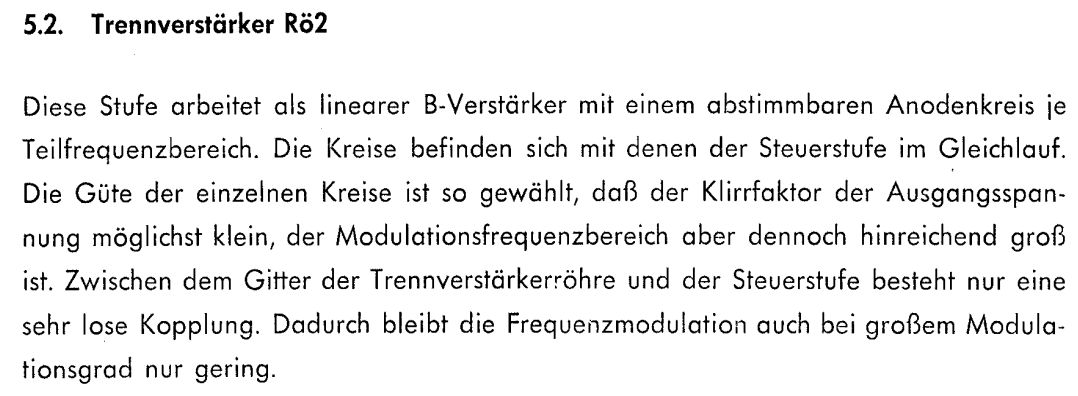 Edi schrieb: > Die HF- Ansteuerung der Endstufe ist also 7V eff. Das wären 20Vss. Hast du mal die durch Gittergleichrichtung erzeugte negative Spannung dort gemessen? Das könnten bis zu -15V sein (20V -4,5V), vermutlich aber eher -10V. Edi schrieb: > Ist nun die Frage: Kann man diese Ansteuerung als B- Betrieb betrachten > ? Ich würde mich nicht so sehr an diesem Wort festbeissen. Bei einer derartig hohen HF-Ansteuerung arbeitet diese steile Röhre hauptsächlich als Schalter und die Modulationsspannung variiert in erster Linie den Stromflußwinkel und damit die Ausgangsleistung. Die Hauptarbeit der R&S-Ingenieure dürfte es gewesen sein anhand der Kennlinien und mittels Experimenten die optimalen Betriebsbedingungen für eine klirrarme Modulation zu erarbeiten. Grundsätzlich war das Verfahren einer solchen Gittermodulation auch damals schon nicht neu.