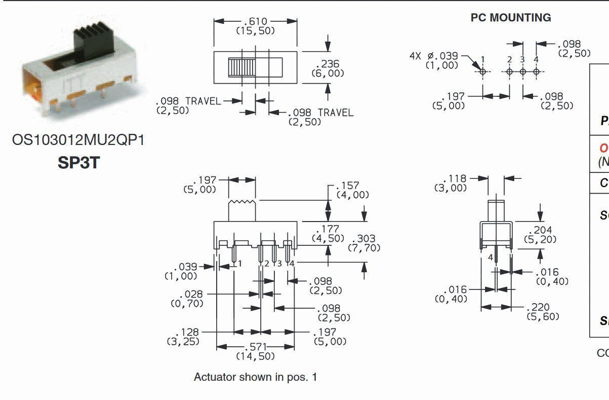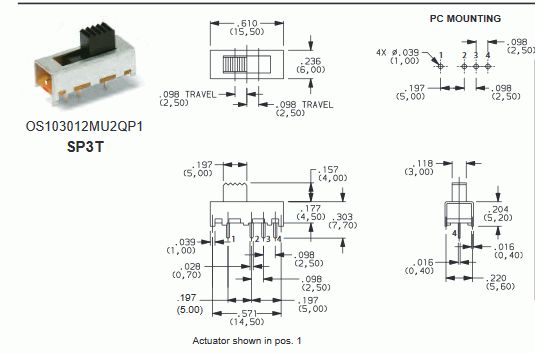 Wenn ich die Zeichnung uli mit dem Lineal am Bildschirm nachmesse sollen es aber tatsächlich 5mm zw. Pin1 und Pin2 sein. So wie Pin2 und Pin4. Ausserdem ist ja uli Pin2-Pin3=2,5mm und Pin3-Pin4=2,5mm also kann die 0,197" zwischen Pin2 und Gehäusepunkt rechts gar nicht sein. Dieser Typ Schalter OS103012MU2QP1 hat kein Befestigungspin, der vom Schaltbild her baugleiche OS103012MU1QP1 hat einen solchen Pin, da ist aber auch das Gehäuse insgesamt marginal größer.