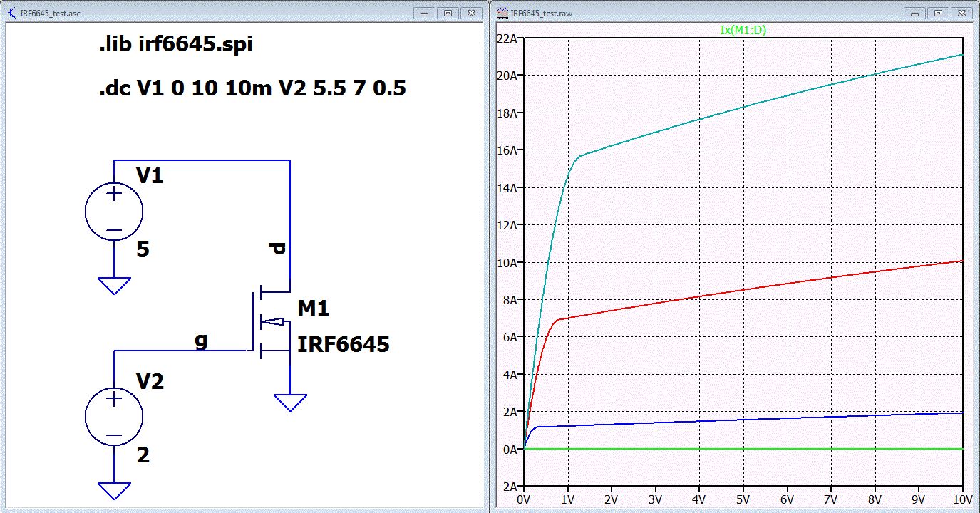 Hei ho alle zusammen, ich möchte gerne eine H-Brücke für einen diskreten Class-D Verstärker aufbauen. Jedoch scheitere ich gerade am einbinden meines Mosfets. Für die H-Brücke möchte ich gerne den oben genannten Mosfet verwenden aufgrund des geringen Rdson. Nun gut, auf dieser Seite gibt es das gewünschte Bauteil. Sogar mit einem Spice Model. http://www.infineon.com/cms/en/product/power/mosfet/20v-300v-n-channel-power-mosfet/80v-100v-n-channel-power-mosfet/IRF6645/productType.html?productType=5546d462533600a401533d2d5b367bbd#ispnTab1 Nun habe ich die .spi in lib umgenannt und mithilfe von Multisim wollte ich diese importieren. Dabei ergab sich folgende Fehlermeldung! (siehe Bild 1) Die txt-Datei lautet wie folgt: ####################################################################### * RS=0 EG=1.11 XTI=3.0 TT=0 * BV=infinite IBV=1mA .MODEL MD1 D IS=1e-32 N=50 +CJO=2.61993e-10 VJ=0.635042 M=0.688536 FC=1e-08 D3 0 5 MD2 * Default values used in MD2: * EG=1.11 XTI=3.0 TT=0 CJO=0 * BV=infinite IBV=1mA .MODEL MD2 D IS=1e-10 N=1 RS=3e-06 RL 5 10 1 FI2 7 9 VFI2 -1 VFI2 4 0 0 EV16 10 0 9 7 1 CAP 11 10 2.61993e-10 FI1 7 9 VFI1 -1 VFI1 11 6 0 RCAP 6 10 1 D4 0 6 MD3 * Default values used in MD3: * EG=1.11 XTI=3.0 TT=0 CJO=0 * RS=0 BV=infinite IBV=1mA .MODEL MD3 D IS=1e-10 N=1 .ENDS irf6645 *SPICE 5-Layer Thermal Model Subcircuit .SUBCKT irf6645t 5 0 R_RTHERM1 5 4 0.667695 C_CTHERM1 5 0 0.0000988 R_RTHERM2 4 3 1.046285 C_CTHERM2 4 0 0.00085636 R_RTHERM3 3 2 1.561168 C_CTHERM3 3 0 0.002809435 R_RTHERM4 2 1 29.28222 C_CTHERM4 2 0 0.02343333 R_RTHERM5 1 0 25.45502 C_CTHERM5 1 0 1.257119412 .ENDS irf6645t ###################################################################### Da ich noch nie ein Spice-Model eingebunden habe verstehe ich den Fehler nicht und hoffe Ihr könnt mir weiterhelfen. Vielen Dank im voraus für eure Bemühungen. Liebe Grüße