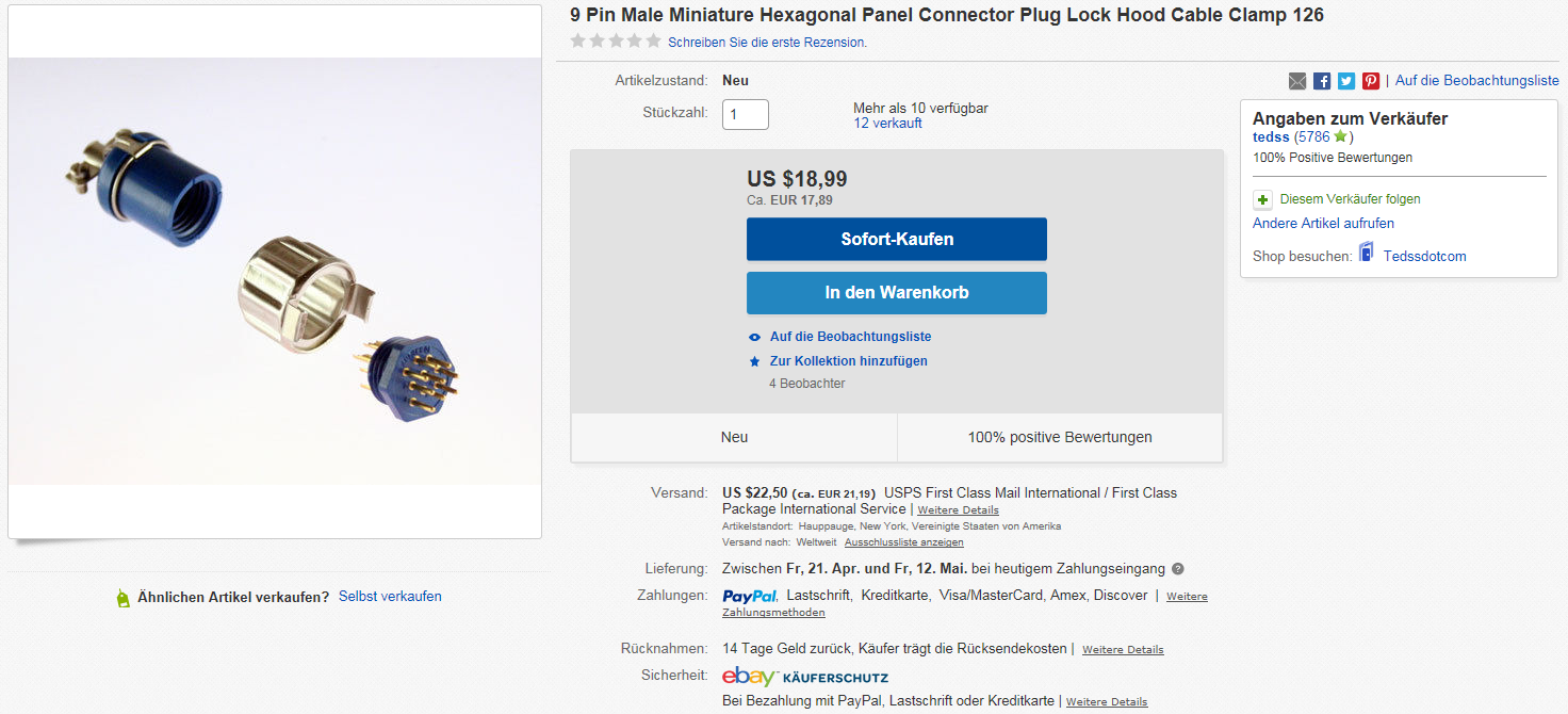 Jep, danke Magnus! Da die Stecker so teuer sind, ist das wohl das beste Angebot das ich finden kann - Ein Freund aus den USA kommt im Mai zu Besuch, ich werde ihn mal Fragen ob er einen Stecker von diesem eBay-Angebot für mich kaufen würde und dann einfach in der Hosentasche mitbringt. Ich komme aber nicht darüber hinweg wie viel diese krüppligen Steckverbinder kosten... Irgendwie denke ich mehr und mehr darüber nach die Buchse in Gerät gegen eine einfach 9-pol. D-SUB auszutauschen. Wäre ich bloß nicht so perfektionistisch! Dann wäre das Problem schnell mit einer Feile und ohne Kosten gelöst.