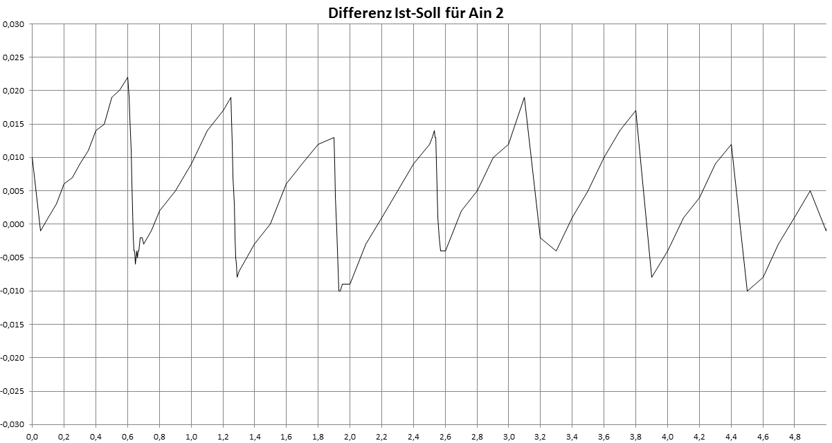 Hallo, in einem I/O-Modul wird als uC ein LPC1549 verwendet. Die Software habe ich aber nicht entwickelt. Für analoge Eingänge wird der integrierte 12-Bit ADC genutzt. Die Referenzspannung wird durch einen externen IC mit 4,096V bereit gestellt. Bei Testmessungen habe ich festgestellt, dass der ADC offensichtlich einen intermittierenden Wandlungsfehler im Bereich von -10mV ...+25mV verursacht. Wenn man die Eingangsspannung in sehr kleinen Stufen (0,005mA...0,01mA) erhöht, ergibt sich die im Anhang dargestellte Fehlerkurve. Als Stromquelle diente ein Kalibrator mit hoher Genauigkeit und Auflösung. Den Sollstrom habe ich auch noch mit einem hochauslösdenden Multimeter kontrolliert. Da gibt es keine Unsicherheiten. Die X-Achse ist in mA skaliert (Spannung über einen 100 Ohm Messshunt). Die dargestellten 5mA entsprechen also einem Spannungsbereich bis 0,5V. Das Verhalten setzt sich aber nach oben weiter so fort und ist gut reproduzierbar. Die y-Achse stellt die Differenz "Istwert-Sollwert" dar. Bei 4,096V Referenz und 100 Ohm Meßshunt kann der Eingang bis 40,96 mA darstellen. Bei 12 Bit ist die Auflösung also 0,010mA. Praktisch zeigt der uC aber auch bei kleineren Schritten eine stetige Stromzunahme mit Auflösung von 0,001mA. Das ist sicher durch die Mittelwertbildung in Verbindung mit leichtem Rauschen zu erklären. Der zackenförmige Fehlerverlauf des ADC mit Amplitude von mind. 3 Digit liegt aber deutlich über der Auflösung des ADC und diesen kann ich mir noch nicht erklären. Hat jemand eine Idee, was das sein kann? Gruß Öletronika