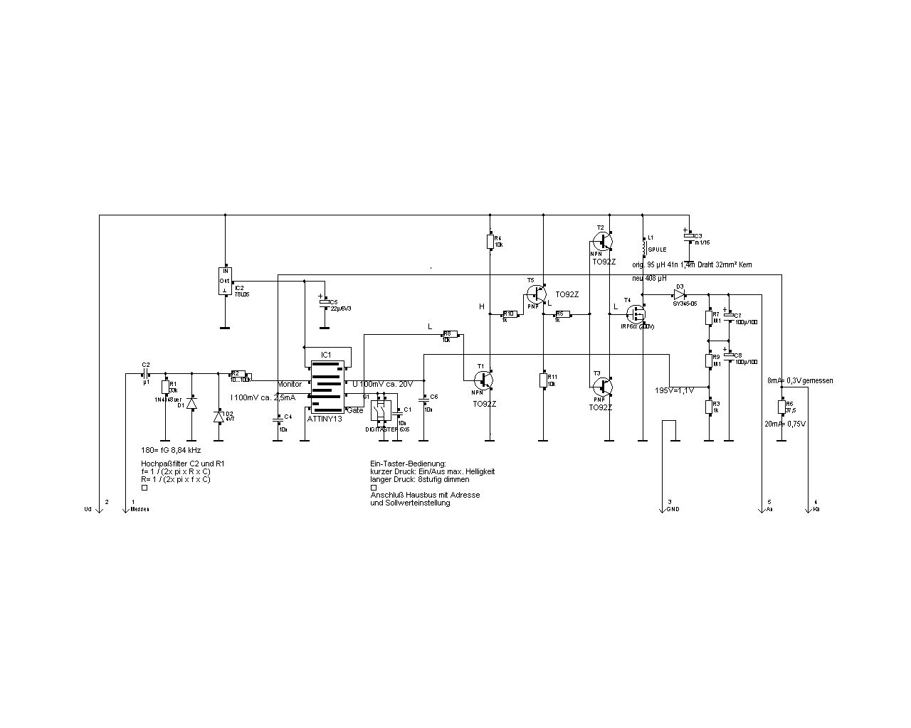 Die 220n/15k habe ich durch ausprobieren ermittelt. Zuerst hatte ich einen Hochpass für 8kHz berechnet, da ließ sich kein Signal für den AT13 ableiten. Prinzipiell ist ein kleiner C besser weil er weniger Umladestrom benötigt. Bei den vorgesehenen Leitungslängen spielt deren Widerstand schon eine Rolle deßhalb der hohe Spannungshub. Und technisch sind die 12 V als Betriebsspannung schon da und auch belastbar genug. PC-Anbindung ist für mich leider nicht realisierbar. Ich müsste mich in ein komplett neues Thema einarbeiten, dazu fehlt mir schlicht die Zeit. Das PC-Netzteil war einfach da und hatte passend 12V für den gesamten Bus und 5V für Module in direkter Nähe. Alle Module brauchen 12V und für den yC 5V. Die 5V werden intern über einen 7805 erzeugt, sind aber als Anschluss herausgeführt. Wo 5V verfügbar sind kann man sie auf den Modulanschluss legen, in diesem Fall Module direkt neben dem Netzteil. Gleiches gilt für die 3,3V der LED Displays. Eine LED Leuchte braucht bis zu einem halben Ampere, da braucht es schon bisschen Leistung. Die Optimierung der Spannungsversorgung bietet schon noch Potential, z.B. Unterstützung durch eine Solarzelle mit Tiefsetzsteller. Das Protokoll hat einen Master, das Adressmodul. Das sendet stur eine fortlaufende Adresse und hat Pause. Das irgendwo am Bus sitzende Messmodul mit dieser Adresse sendet dann seinen Meßwert. Danach kommt die nächste Adresse dran usw. Synchronisation über Pausenlänge 1/3/22 bit und über L/H Wechsel in der Bitreihe. Vorteile sehe ich in einem einfachen Protokoll da keine Paritäten, wer senden darf ausgehandelt wird, der großen Toleranz in der Busfrequenz und dem transparenten Datenstrom. Wer Interesse an den Schaltplänen hat dem sende ich sie zu als .t3001 oder was das Exportmodul von target so hergibt. Der Strombedarf meiner Treiberstufe ist minimal. Ruhestrom gegen 0, beim senden je nach Last. Ein Treiber IC ist meines Erachtens nicht nötig, es funktioniert ja.