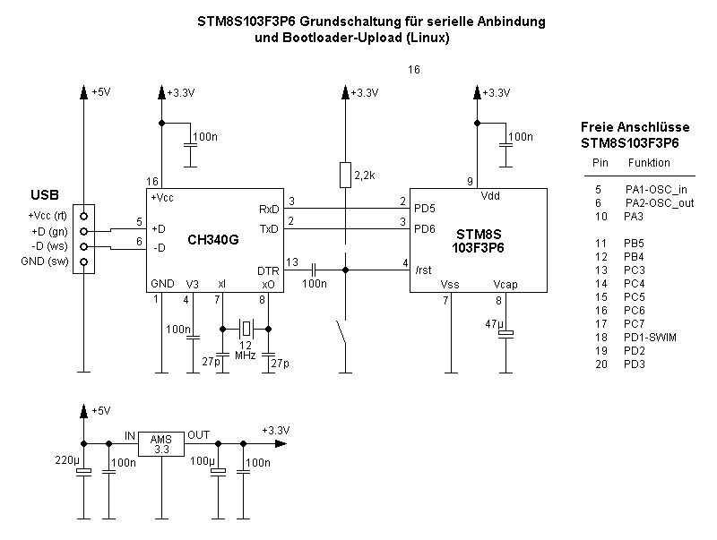 Weil ich gerne mit so wenigen Kabeln wie möglich hantiere, habe ich bisweilen auch gegen Bootloader bei MCU's nichts. Bei den STM32 sind serielle Bootloader integriert, für die AVR's gibts Unmengen nur für den STM8S103F3P6 (der ultrabillige Chip den es auch auf einem minimalistischen Board fast ohne alles dafür für 65 Cent gibt) gibt es keinen Bootloader (und er ist auch einer der wenigen Vertreter der STM8 Familie die keinen Bootloader integriert hat). Also habe ich einen selbst geschrieben (und mich dadurch etwas tiefer mit der Maschinensprache und dem Chip selbst auseinandersetzen müssen). Der Assemblercode ist sicher verbesserungsfähig, aber er tut (nur leider nicht so schnell wie ich es gerne hätte, was jedoch zum großen Teil der Programmierzeit geschuldet ist, wenn der STM8 sich selbst flasht). Der Bootloader ist mit "naken_asm" geschrieben, von dem ich zuvor noch nie etwas gehört habe. Sehr minimalistisch (u.a. keinen Linker), aber für das was ich vorhatte ziemlich richtig. http://www.mikekohn.net/micro/naken_asm.php Das Hostprogramm, das den STM8 mit dem Hexfile füttert ist mit FreePascal geschrieben (hey, ich hatte dafür schon die Auswertung des Intel-Hex Files in der Schublade und wollte das nicht neu machen). Außerdem funktioniert es. FreePascal findet man hier: http://www.freepascal.org/download.var Das im Zip-Paket enthaltene stm8_bootflash ist für Linux 32-Bit geschrieben, wer es für ein 64 Bit System benötigt muß es sich selbst übersetzen. Leider gilt auch für meinen STM8 - Bootloader das "Henne-Ei Problem", man braucht einen Programmer um einen Programmer oder einen Bootloader zu flashen. Der STM8 Bootloader konnte unkompliziert mit STM8FLASH und einem China-Clone ST-Link v2 geflasht werden. STM8FLASH gibts hier: https://github.com/vdudouyt/stm8flash Auf einem der Bilder sieht man, wie ein einzelner STM8 Chip mit dem ST-Link v2 verbunden werden muß. Der Bootloader wird mittels: stm8flash -c stlinkv2 -p stm8s103f3 -w bootloader.ihx in den Chip geflasht. Fortan steht der Bootloader zur Verfügung und kann mittels serieller Schnittstelle geflasht werden. Wird die DTR-Leitung einer seriellen Schnittstelle über einen Kondensator mit dem Resetanschluss des STM8 verbunden, so gelangt der STM8 automatisch in den Programmiermodus. Werden nur RxD und TxD verbunden, so muß kurz nach dem Flashprogrammaufruf am STM8 ein Reset durchgeführt werden. Prinzipiell ist der Bootloader sehr "Arduino-Style", da der Bootloader eine gewisse Zeit nach einem Reset wartet und testet, ob ein Zeichen (hier "u") eingegangen ist oder nicht. Ist ein Zeichen eingegangen wird der Flashmodus aktiv, wenn nicht, wird das im STM8 enthaltene Userprogramm ausgeführt. Gebrauch des Flashprogramms: stm8_bootflash Schnittstelle Hex-File [optional: notxbar] Beispiel: stm8_bootflash /dev/ttyUSB0 blinky.ihx Wird der Bootloader von einer IDE aufgerufen, so kann es sinnig sein, diesen ohne den Konsolenfortschrittbalken zu starten (bessere Ausgabe in einer IDE): stm8_bootflash /dev/ttyUSB blinky.ihx notxbar Viel Spaß damit (wers brauchen kann), Ralph PS: der Schaltplan zeigt, wie man den STM8 an einen (ultrabilligen China-Chip) anbinden kann. Vllt. mache ich mal ein EVAL-Board im Stile eines Arduino Nano daraus.