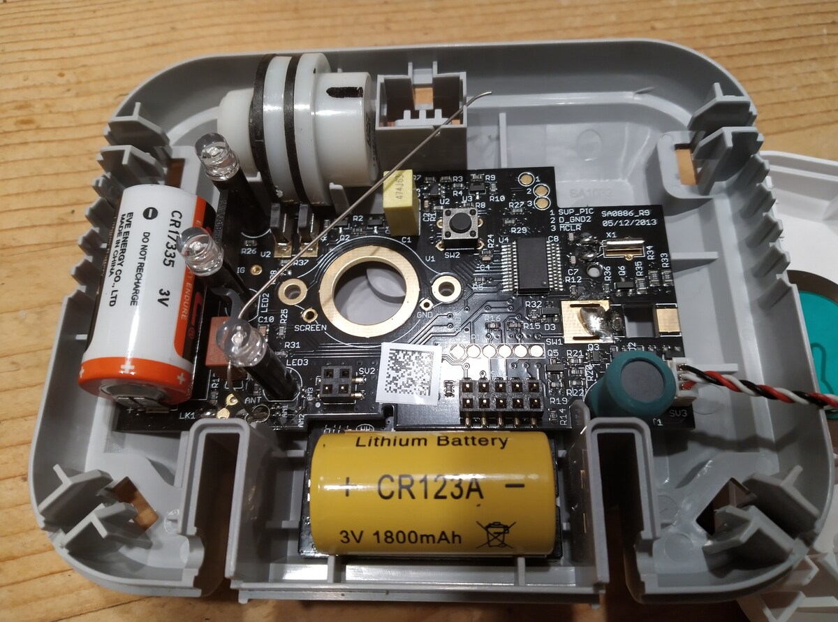 Fireangel W2-CO-10X CO Funkmelder Vor ein paar Tagen habe ich einen Fireangel CO Melder in die Finger bekommen. Der Melder ist laut Prägungen im Plastik 2015 hergestellt und piept alle 45 Sekunden. Also das optimale Exemplar um es aufzumachen und hinein zu sehen. Das Gehäuse wird von vier Clipsen zugehalten. Diese muss man nach innen biegen um das Gehäuse zu öffnen. Die Elektronik ist ganz anders als bei den Rauchmeldern. Auf der Seite sitzt ein großer Sensor. In der Mitte die Platine mit einer EVE CR17335 Batterie drauf (aus der berüchtigten 2015er Serie). Die Batterie hat allerdings Beinchen (1x Plus 2x Minus) und nicht Lötfahnen, wie die in den Rauchmeldern. Am anderen Rand ist eine Standard Funkmodul eingesteckt, mit einer eigenen, in diesem Fall gelben Batterie. Ich habe den CO Melder mit 2 anderen Rauchmeldern verbunden und mit dem W2-MM Modul geschaut, was das Modul so erzählt. Obwohl die Spannung des Funkmoduls mit 2,67V nicht hoch ist, findet der CO Sensor die Spannung von Funkmodul und Melder in Ordnung. Auch die Battery Impedanz wird als in Ordnung angesehen. Aber: Es gibt einen Punkt "Battery Life", den die Rauchmelder nicht haben und dieser ist ROT. Vermutlich piepst der Melder deshalb. Also habe ich erst bei der Batterie im Melder eine zweite Batterie parallel geschaltet und dann beim Funkmodul. Leider hat beides nicht gegen das piepen oder die Anzeige von "Battery Life" geholfen. Fazit zum aktuellen Zeitpunkt: Batteriewechsel hilft hier möglicherweise nicht. Grüße, John