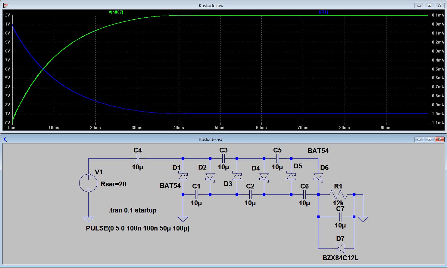 Für ein Projekt benötige ich 12 V und 0,5 - 2 mA. Da noch Pins am vorhandenen µC (ATMega328) frei sind, stelle ich mir vor, ein Rechtecksignal von 10 kHz auszugeben und damit eine Villard-Kaskade zu versorgen. Im Anhang ist die Simulation der Schaltung mit LTSpice (R1 ist die Last, V1 der Pin mit 20 Ohm Ausgangswiderstand, gezeigt wird die Spannung über R1 bzw. der Strom durch R1). Kann die Schaltung verbessert/vereinfacht werden? Gibt es eine geeignetere Alternative zur Erzeugung der 12 V?