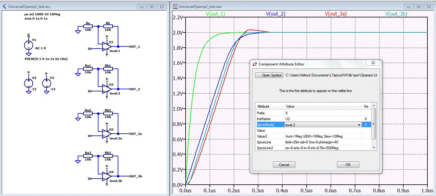 Es gibt in LTspice universelle Modelle - opamp und UniversalOpamp2. Beim UniversalOpamp2 kann man aus 4 Modellen wählen. Ich habe mal ein Beispiel gemacht. Durch Rechtsklick auf das Symbol kommt man in das Fenster um die Parameter zu setzen und um das Modell auszuählen. Zum Modell wählen dort einen Doppelklick in das Feld mit level.x machen. Slew=10Meg bedeutet 10V/us