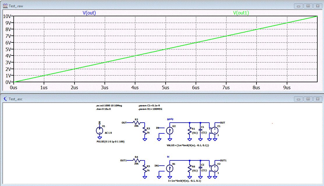 Hallo Stefan, Ich habe dir mal ein Beispiel gemacht. Werde mir aber mal die Beispiele von hier umsetzen und hier einstellen. http://www.ecircuitcenter.com/OpModels/Ilimit_Slew/ILim_Slew.htm Man muss ja nicht immer bei null anfangen. Du hast PSPICE-spezifische Syntax verwendet. Das findest du im Manual von PSPICE aber nicht in einem allgemeinen SPICE-Buch. VALUE={1m*limit(V(in), -0.1, 0.1)} LTspice versteht diese Syntax auch. Dafür nimmt man das Symbol gpoly in LTspice. in nativem LTspice würde man eine Bi-Quelle nehmen. Die Formel wäre damit I=1m*limit(V(in), -0.1, 0.1) Gruß Helmut