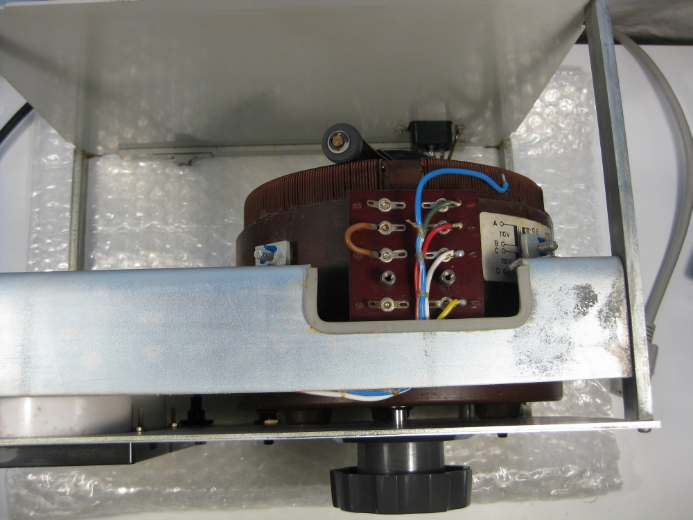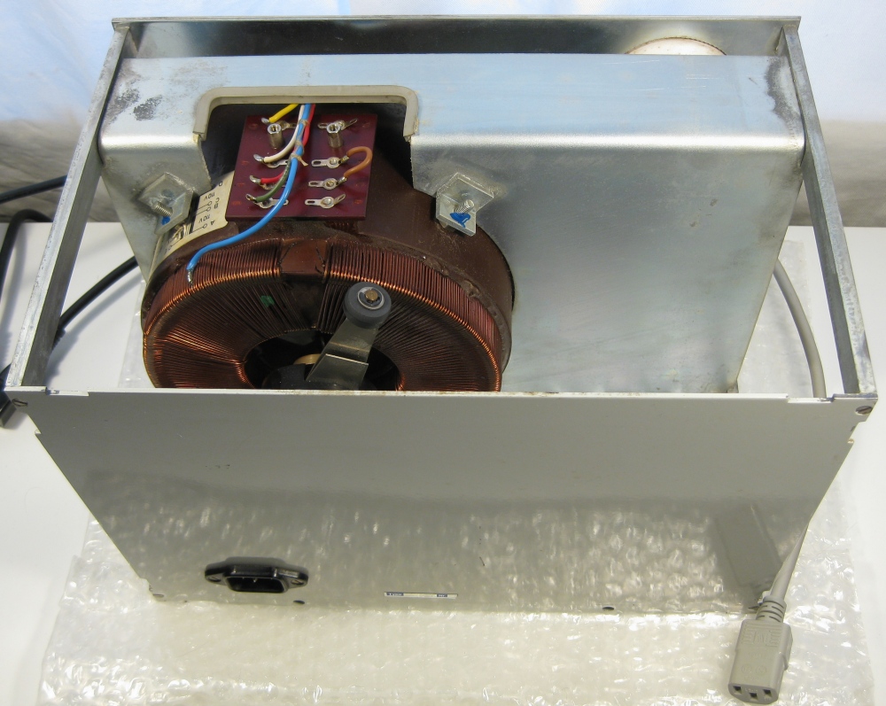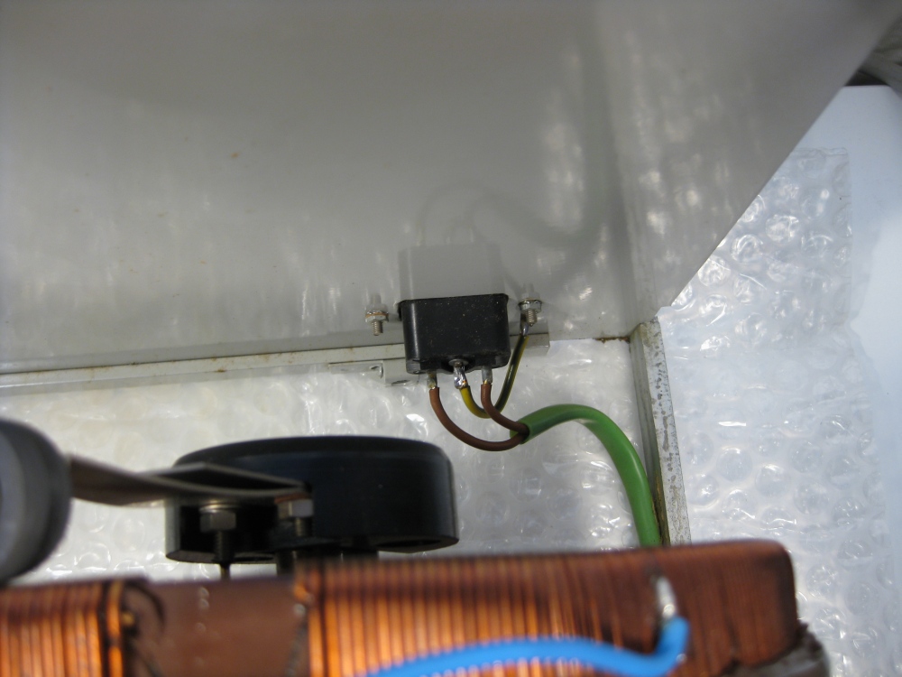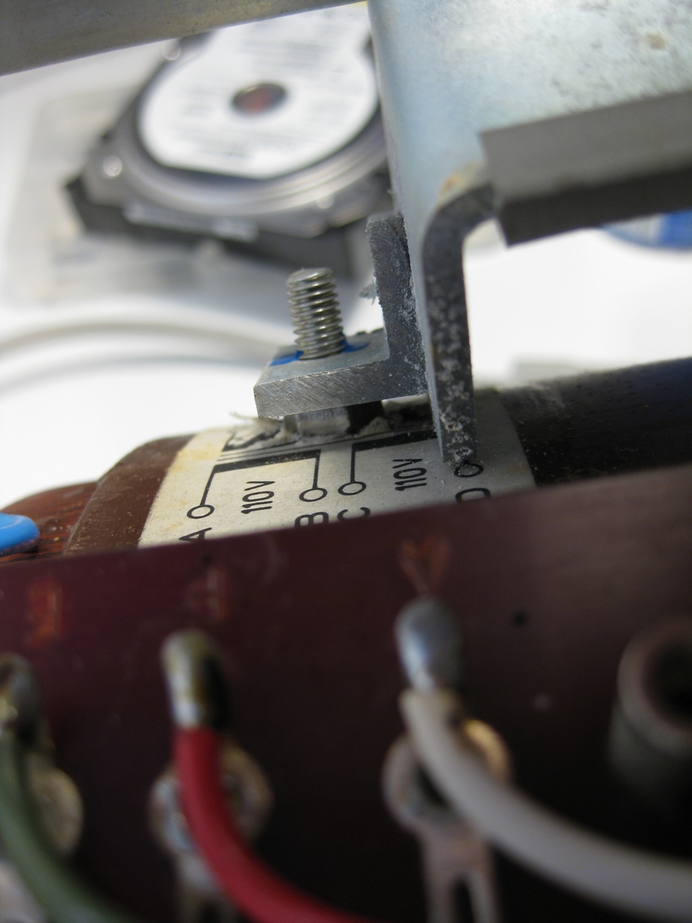 Hier noch ein Bild auf dem man besser sieht wie der Trafo montiert ist. Der Trafo wird nur durch vier Klemmschauben gehalten. Die Sechskantköpfe drücken gegen den Trafo und halten ihn so. Da kommt mir gleich eine Idee, ich könnte zwischen die Schraubenköpfe und den Trafo Gummistücke einfügen ...
