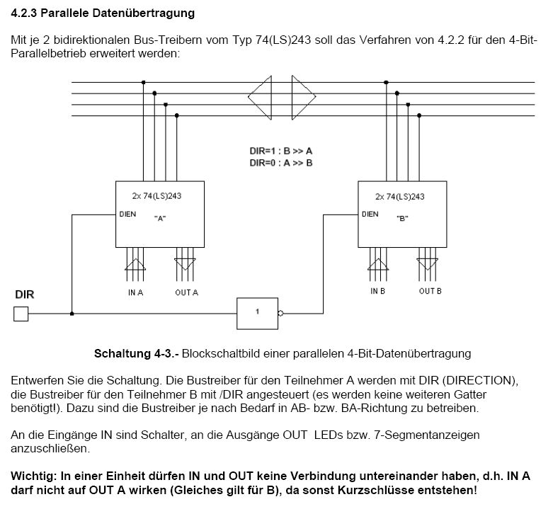Schön, wo finden wir 4.2.2? Du musst die Gate-Eingänge so beschalten, dass sie auf das extern anliegende DIR-Signal reagieren... Dazu sollte der Sender der beiden LS243 zwischen Durchgang und "Isolation" (vermutlich Tristate) umschalten, um die Datenleitung nicht zu belasten (und Kurzschlüsse zu verhindern. Die Gate-Leitung des Empfängers kann man dann entweder so beschalten, dass er alle Signale anzeigt (Echo) oder nur, wenn empfangen werden soll. Die Leitungen zum Bus müssen dann nur noch verbunden werden... Ich hoffe, ich konnte dir bei deiner Hausaufgabe etwas helfen...