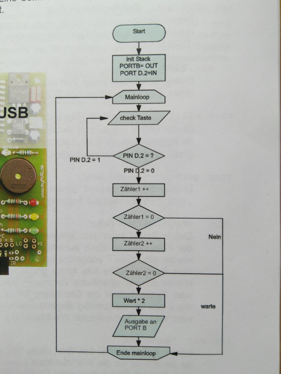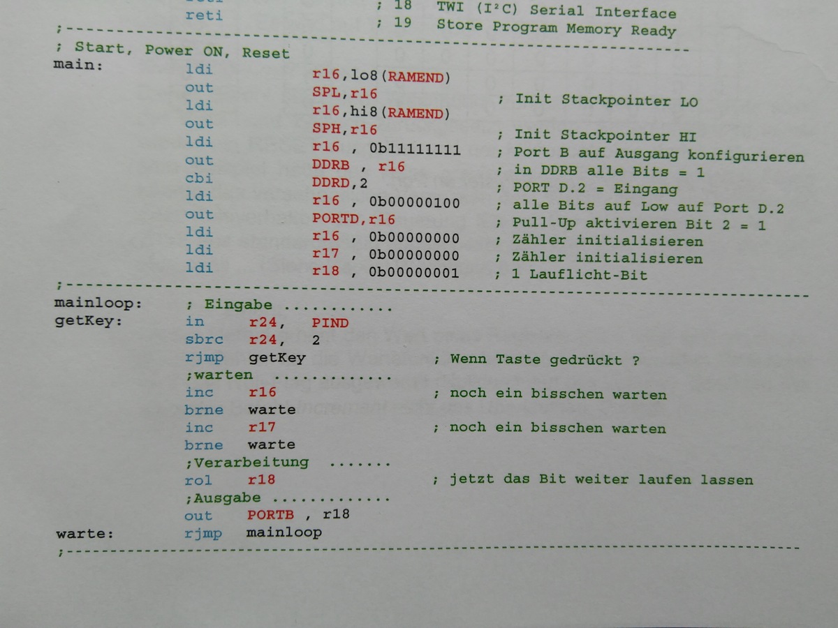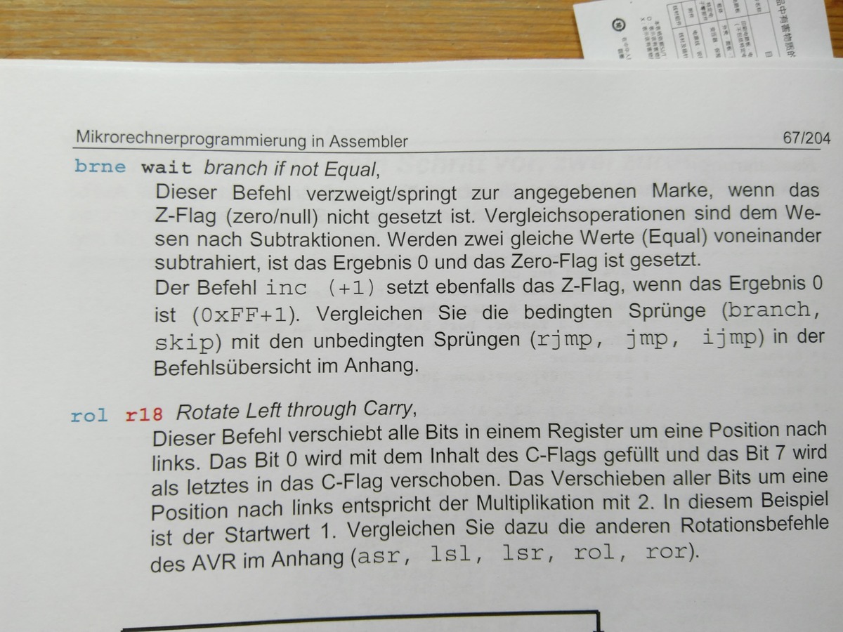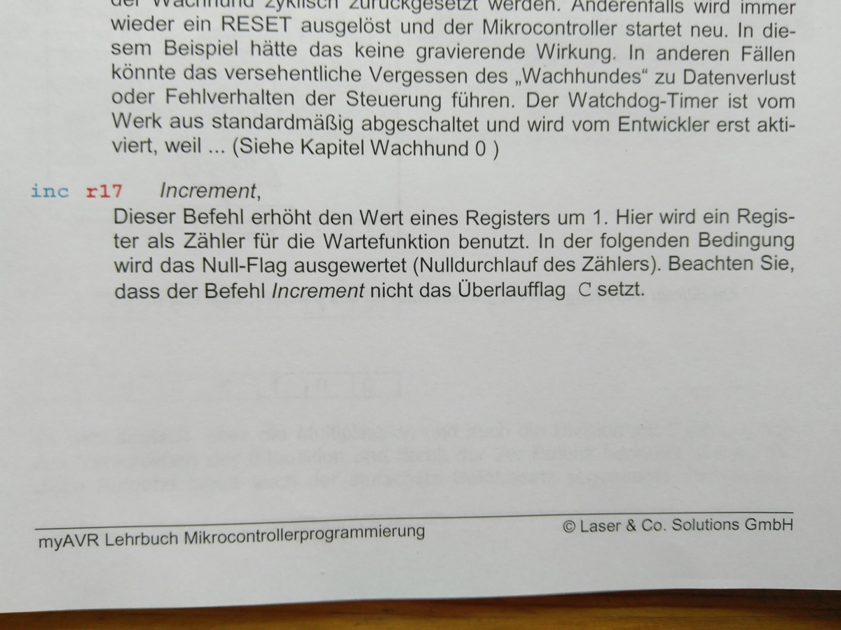 Hallo, Im Anhang ist der PAP, der Code, und die Erklärung dazu. (Code ist aus einem Lehrbuch) ich wollte mal fragen ob ich das richtig verstanden habe. Es geht um die Warteschleife und die dafür gemachten Zähler 1 und 2. r16 soll Zähler 1 sein. r17 soll Zähler 2 sein. Ich habe das so verstanden. Die register r16 und r17 werden zuächst auf "0" gesetzt. Anschließend wird bei Tasterdruck der Befehl "inc" verarbeitet. Dieser Befehl bewirkt dass sich das Register 16 um +1 erhöht. also: 1. durchlauf 0b0000 0001 2. durchlauf 0b0000 0011 3. durchlauf 0b0000 0111 usw. bis 0b1111 1111 dann wird es wieder "0" = 0b0000 0000 Das erwähnte Z-Flag wird jetzt gesetzt?? richtig? "brne" prüft das Z-Flag, wenn das Z-Flag gesetzt ist dann wird zum nächsten zähler gewechselt. Das gleiche passiert nun mit r17. anschließend wenn der Taster immer noch gedrückt ist, dann wird der befehl "rol" ausgeführt. Habe ich das richtig verstanden dass dieser gesamte Ablauf während eines kurzen Tasterdrucks geschieht ? D.h. der Microcontroller führt das im Milisekunden Bereich aus...