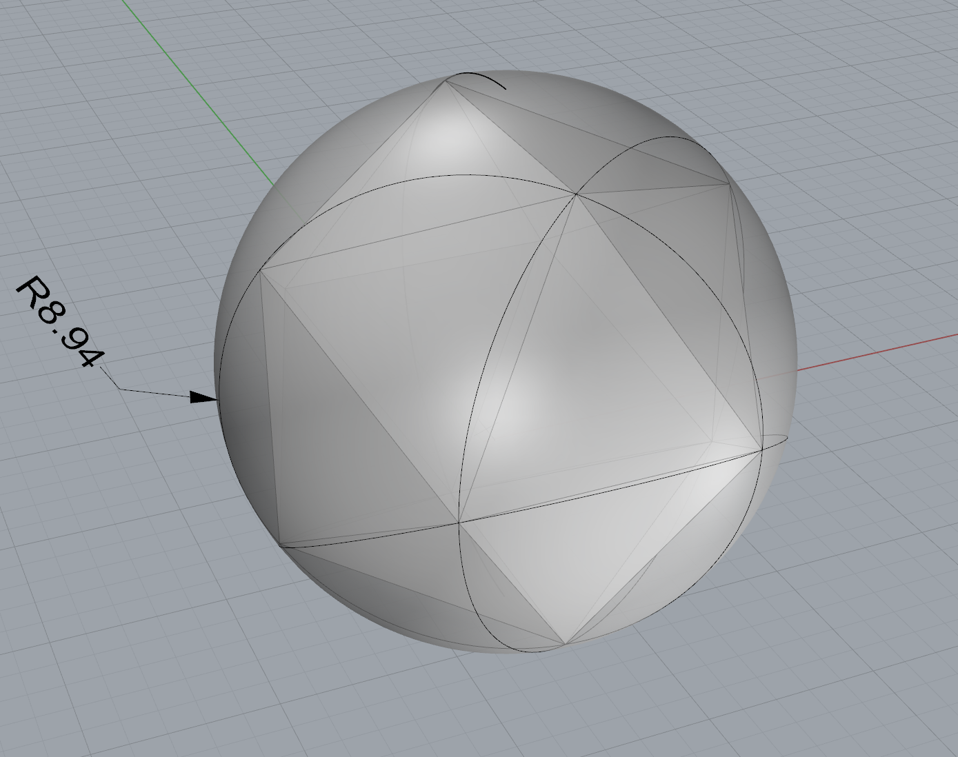 Hi, Du könntest es so machen, wie man auf der Ebene auch ein gleischenkliges Dreieck konstruiert. Steckzirkel nehmen, passenden Radius einstellen, beliebigen Punkt wählen und einen Kreis drum zeichnen, belieben Punkt auf den Kreis wählen und wieder einen Kreis machen, um den Schnittpunkt der beiden wieder einen Kreis usw. Bei 20mm wäre der Radius 8.94mm, Zirkel spitzen etwas nach innen biegen, so dass sie halbwegs normal zur Kugel stehen. 20mm ist ziemlich kein, aber ich denke schon, dass man das sauber hinbekommen könnte. Grüße Flo
