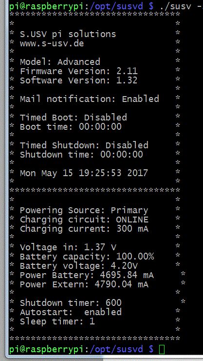 Guten Abend, ich habe für meine Raspberry Pi B+ eine USV der Firma S.USV vom Typ USV pi advanced gegönnt und erfolgreich im Betrieb genommen. Folgende Werte kann ich aus der USV auslesen: Siehe Anhang Meine Frage kann ich diesen Status auch im Browser anzeigen lassen? Mario