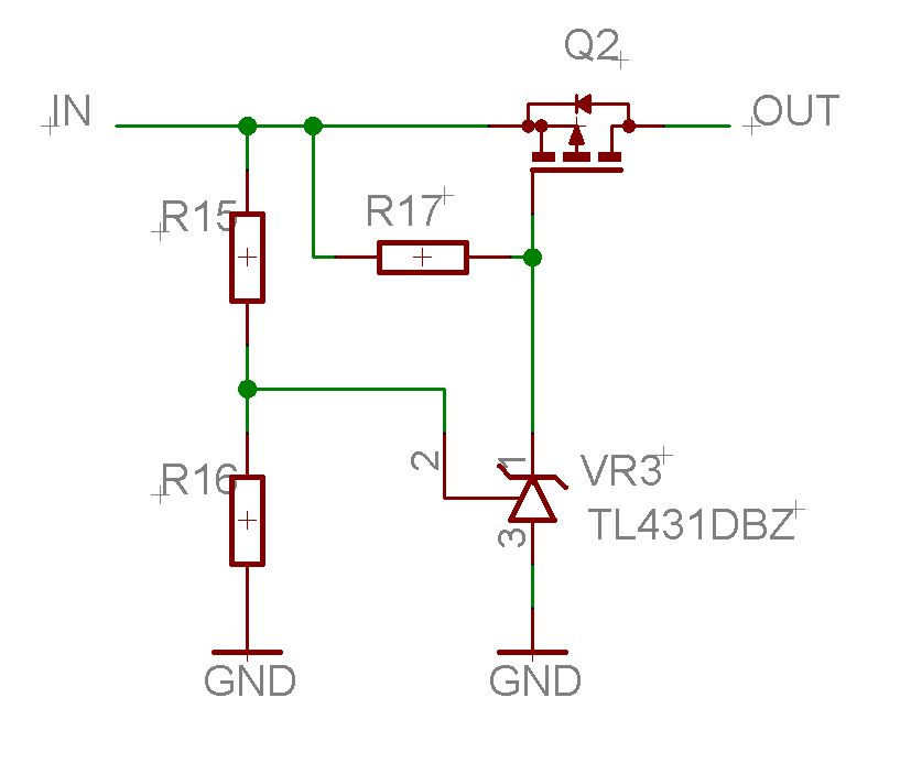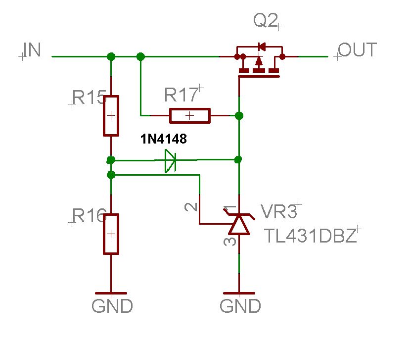Mal ne minimal Idee von mir (ungetestet). Bei Spannung über 2,5V an TL431 Pin2 geht Gate von MOSFET (P-Kanal) auf low und schaltet Strom durch. Unter 2,5V sperrt der TL431 und der Pullup(R17) sperrt den MOSFET. Für Akku Sachen natürlich eher ungeeignet da das Ding keine Hysterese hat :)