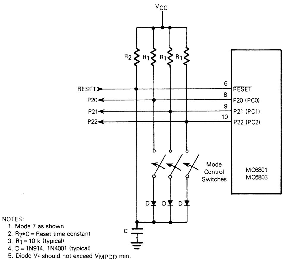 Bisher hatte ich keine Probleme mit meinen Motorolla MC6803 "Retrocomputer" jetzt spendiere ich aber einen "vintage" Mathe Koprozessor und der benötigt mindestens 200 ms Reset auf low. Welcher Ohmwert braucht R2 und wiviel Farad der Kondensator um Reset, egal ob nach power on oder manuel via Taster, 200 ms low zu halten. Wenn Reset auf high geht liest der MC6803 seinen Betriebsmodus über Port 2 bits 0,1 und 2 damit man die 3 leitungen nach dem Reset auch wieder für andere I/O Aufgaben nutzen kann sind die Dioden von nöten. Nicht eingezeichnet ist der Resettaster und das der Mathechip an der gleichen Resetleitung hängt. Wäre zwar nett wenn mir Jemand die Werte nennen könnte damit es sicher funktioniert aber am liebsten auch mit dem Rechenweg damit ich künftig es selber Berechnen kann. Danke für Euer Bemühen. DJ
