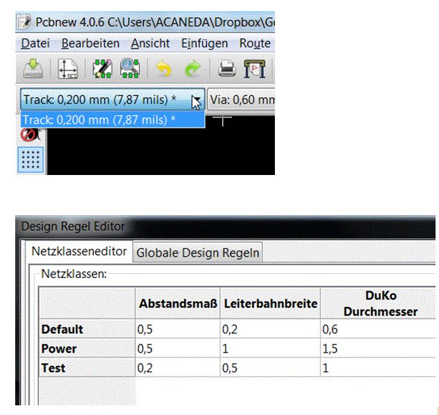 Hello, habe eine Frage zu den KiCad Designregeln des Pcbnew-Programms. Habe im Netzklasseneditor die Netzklasse "Power" (zusätzlich zur vorgegebenen Netzklasse "Default") mit einer größeren Leiterbahnbreite (und auch die DuKo-Durchmesser angepasst) editiert. Wenn ich nun ein "Autoroute" - "Alle Footprints automatisch routen" durchführe, werden ALLE Leitungen nur mit der Default-Leiterbahnbreite gezeichnet; auch jene Leitungen, denen ich die Netzklasse "Power" im Designregeleditor zugeordnet habe. Danach kann ich (was mühsam ist) jede Power-Leitung mit dem Cursor "anpeilen", die rechte Maustaste drücken und vom nun geöffneten Menü den Befehl "Breite von Leiterbahn ändern" antippen und damit ändert sich die Leitebahnbreite automatisch an die in den Designregeln vorgegebenen Leiterbahnbreiten. Frage: Besteht eine Möglichkeit, dass die Leiterbahnen beim automatischen routen sofort in der richtigen Breite gezeichnet werden? LG Georg PS: Das File "Track.PNG" ist nicht relevant (kann es leider nicht löschen).