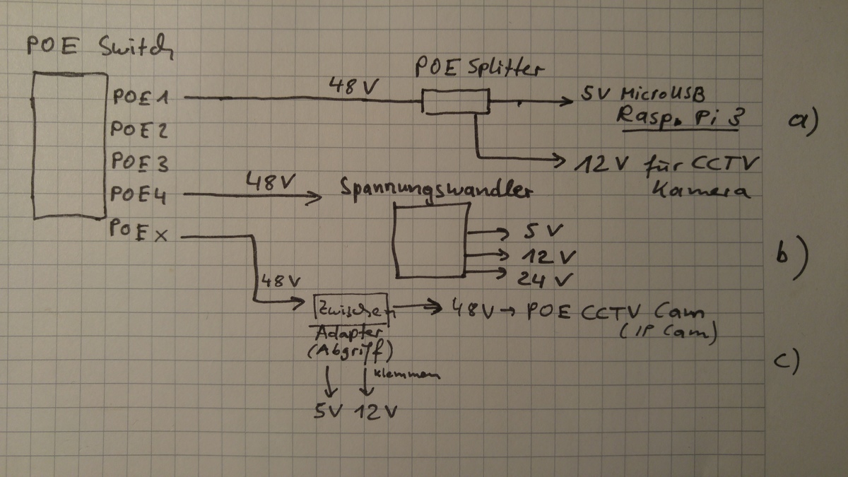Ich habe verschiedene Sachen, die ich über POE versorgen möchte. Dementsprechend benötige ich auch unterschiedliche Spannungen. Den jeweiligen Weg habe ich mir - wie auf dem Bild skizziert - gedacht. Natürlich sollte alles möglichst günstig umzusetzen sein. Hat hier wer konkrete Vorschläge für die Realisierung der einzelnen Wege bzw. spricht irgendwo was dagegen?