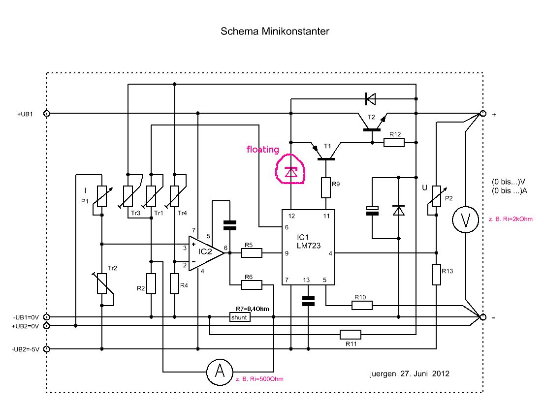 Hi, schau mal: http://www.hobby-bastelecke.de/projekte/netzteil_lm723.htm Nach dem Datenblatt des LM 723 ist ein stabiler Betrieb erst ab einer Referenzspannung von 2 Volt am Pin 5 gewährleistet! Oft wird aber weniger genommen, weil die Spannung am Pin 5 gleichzeitig die kleinstmöglich einstellbare Spannung ist. Wenns trotz richtigen Aufbau nicht funktioniert, sollte man erstmal probieren, die Spannung an Pin 5 auf 2 Volt zu bringen. Dazu ändert man den Widerstand R5 auf 8,2 Kiloohm, und R 6 auf 3,3 Kiloohm, was etwa 2 Volt am Pin ergibt. R4 wird auf etwa 680 Ohm geändert (bei 30 Volt Eingangsspannung). ciao gustav
