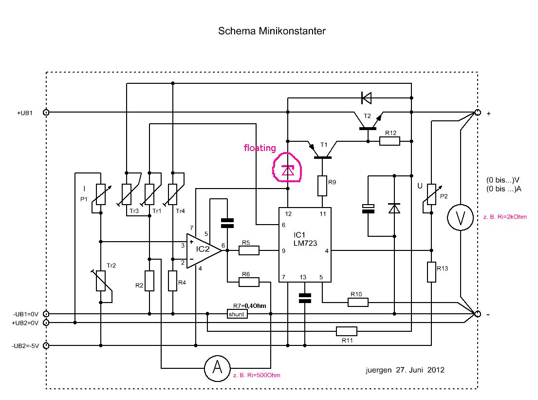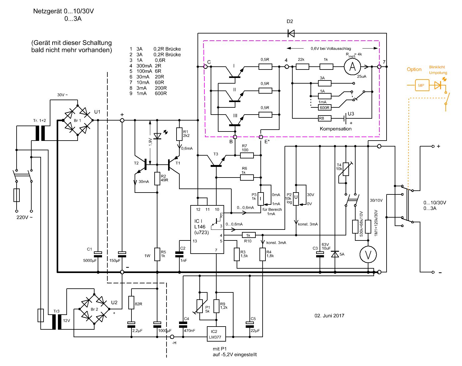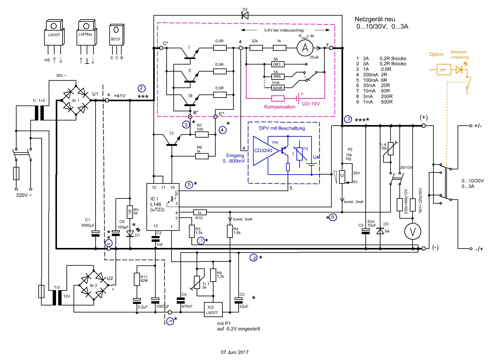 Den Strommesser kann man auch an eine andere Postion verschieben, bzw. auch einfach am Shunt für die Strombegrenzung messen. Das ist das kleinste Problem. Die Spannung wird bei dem Plan eher nicht bis 30 V gehen: vom 24 V Trafo wird man irgend was zwischen etwa 30 und 35 V bekommen, je nach tatsächlicher Netzspannung. Der LM723 kann davon maximal etwa 2-2,5 V weniger ausgeben, also eher was zwischen 28 und 33 V als Maximum. Wenn der Trafo mehr Spannung liefern würde hätte man wieder die Gefahr die Grenzen des LM723 zu überschreiten. Das Maximum für diese Art schaltung liegt bei etwa 34 V - der LM723 braucht dann eine stabilisierte Versorgung mit etwa 37 V, also das empfohlene Maximum. Bei mehr als 24 V AC von Trafo sollte man die Versorgung für den LM723 begrenzen. Das Problem ist halt das untere Limit von hier 1.2 V - auch das ist schon etwas unter den Spezifikationen kann aber noch mit den meisten der xx723 funktionieren. Man kann die Teiler bei der Referenz und dem FB anpassen, so dass man dann auch fast bis 0 V runter regeln kann. Besser wäre auch der Poti auf der Referenz Seite. Die Stromregelung wird nicht super präzise, weil der Strom für den Feed-back Teiler mit gemessen wird. So groß ist der Fehle aber auch nicht.