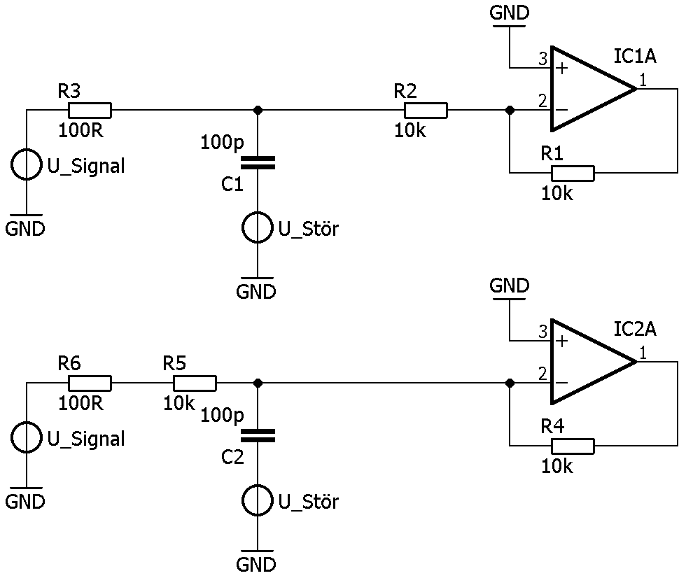Hallo Forum! Mir kommt aktuell eine mehr oder weniger esoterische Frage: Ich habe mehrere Module, welche analoge Signale ausgeben. Diese summiere ich später [1]. Da die einzelnen Module etwas größer sind, stellt sich die Frage der Störempfindlichkeit der Leitungen. Sollte ich eher die Widerstände nahe am OpAmp plazieren und so jedes Signal über die Platine führen. Oder, ist es möglich den virtuellen GND am OpAmp - sternförmig an alle Generatoren zu leiten? Letzteres würde mehrere Leitungen sparen, welche sonst quer über die Platine verlaufen, so wäre es nur eine. Ich bin mir aber nicht ganz sicher, ob der virtuelle GND dann nicht empfindlicher ist als die Spannungen. Bin für Ideen und Erfahrungen dankbar! [1] https://en.wikipedia.org/wiki/Operational_amplifier_applications#/media/File:Op-Amp_Summing_Amplifier.svg