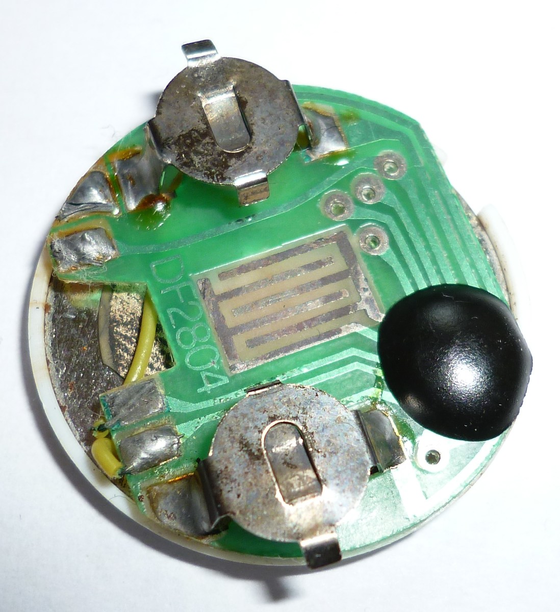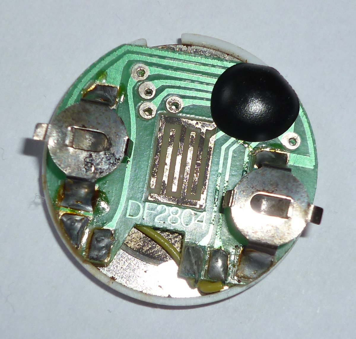 ...also, sieht halb so wild aus. Da wo der Gumminippel saß musst du die fächerartigen Leiterbahnen mit 1000er Schmirgel polieren, ggf auch die Kontakte in/unter den Batteriehalter. Die LED wieder POLUNGSRICHTIG anlösten (sie hat eine flache seite am Gehäuse, das ist Minus). Der Gumminippel hat einen schwarzen Kohleleitergimmipömpel drin - vll ist der auch hin, einfach etwas Alufolie da reinkleben. Das sollte es dann fast schon gewesen sein. Interessehalber: Was für ein Spielzeug ist das, dass sich der Aufwand lohnt? Klaus.