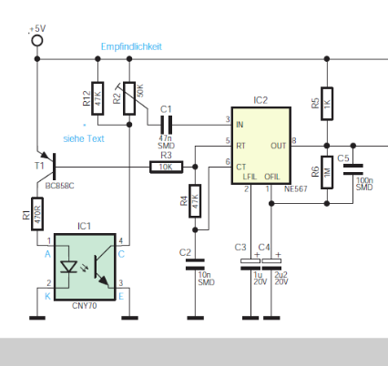 Das Bild hab ich in meiner Schaltungssammlung gefunden. Kurze Erklärung: der LM567 ist eine PLL mit Frequenzdiskriminator. Er liefert ein Signal, wenn die Eingangsfrequenz gleich (oder in der Nähe) seiner Oszillatorfrequenz ist. Wenn man also den Laser moduliert und die Frequenz des VCO in der PLL auf dem gleichen Wert hat, bekommt man ein Ausgangssignal. Die Schaltung hier geht noch etwas weiter. Bei einer Reflexlichtschranke sind Sender und Empfänger ja beieinander. Da kann man den Sender auch gleich mit dem VCO der PLL ansteuern. Statt des Reflexkopplers CNY70 kann man für größere Entfernungen natürlich auch einen billigen Laser aus einem Werbekugelschreiber und einen Phototransistor verwenden. MfG Klaus