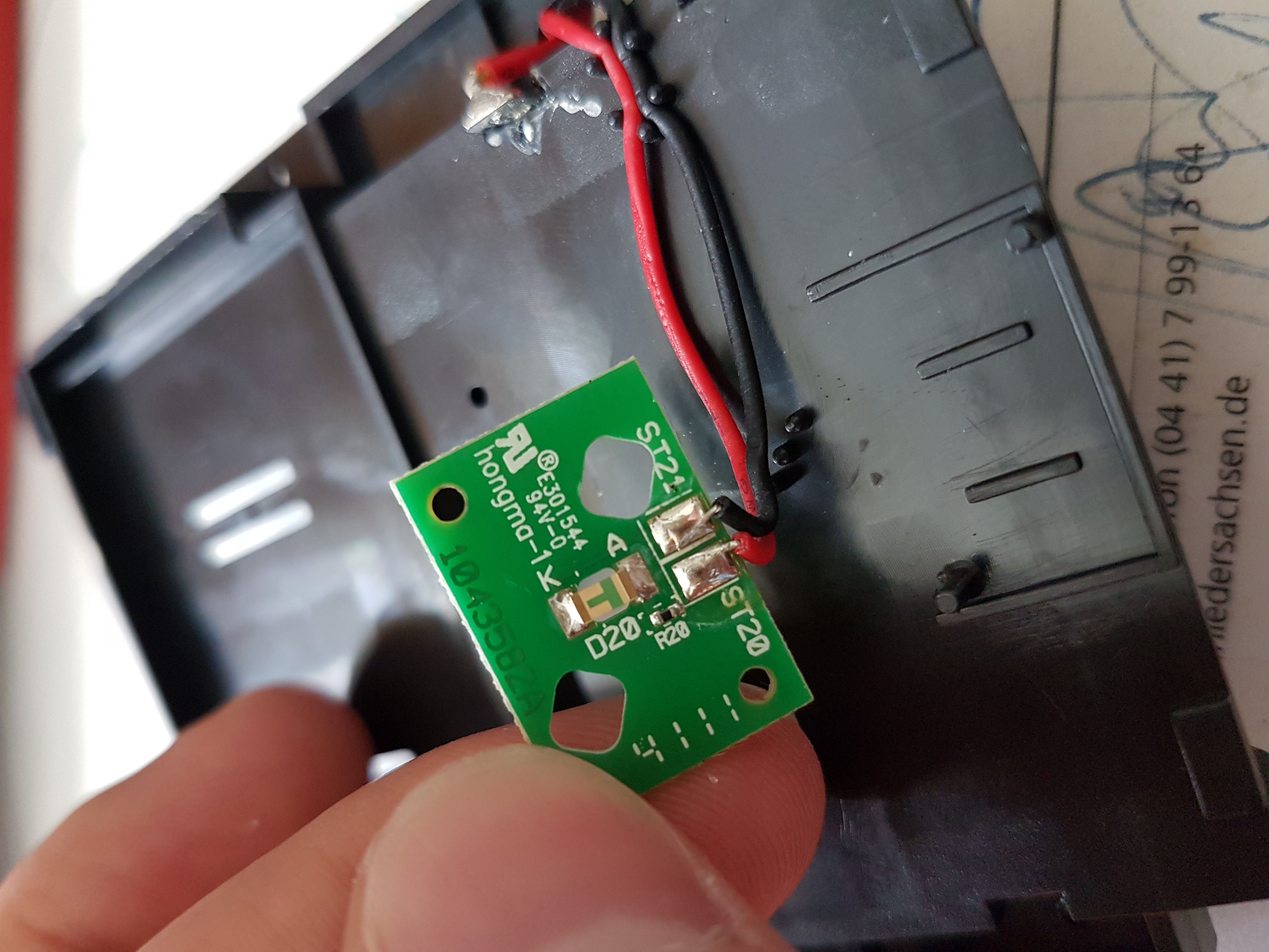 Hey vielen Dank für deine schnelle Antwort. Ich weiß die Bilder sind sehr groß aber ich wollte eine vernünftige Auflösung bereitstellen, wenn es um Bauteilidentifizierung geht. Ich habe auch schon die Hoffnung auf das kleine Bauteil oben gesetzt, konnte aber auch nicht herausfinden was das genau ist. Das Erwärmen mit einem Finger habe ich schon probiert aber ich vermute in dem µC ist eine zeitliche Verzögerung oder etwas der gleichen drin - jedenfalls konnte ich keine Änderung feststellen.