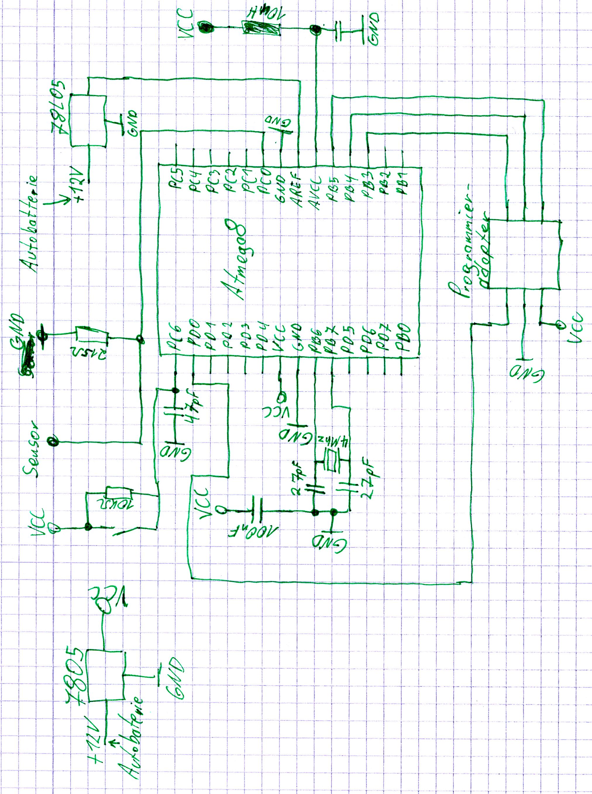 Wenn ich das richtig sehe, fehlen an den Spannungsreglern die Abblockkondensatoren. 1µF direkt an den Ausgang jedes Reglers, 100µF direkt an den Eingang jedes Reglers. Ohne schwingen die Teile wie Sau. Direkt am Controller 100nF keramisch von VCC gegen GND und ebenfalls 100nF von AVCC gegen GND. Autos sind rollende Streubüchsen, deshalb 10kOhm zwischen ADC-Eingang und Knoten 251Ohm-Widerstand - Sensor. Vom ADC-Eingang 100nF gegen GND. Bei allen Kondensatoren auf kurze Verbindungen achten. Wenn das nicht hilft, dann weiss ich leider auch nicht weiter. Gruss Jadeclaw.