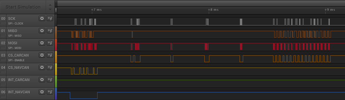 Uh, ich hatte wirklich ein Messproblem. Habe nicht umrissen das ich beim LA nur mit 1MS/s abgetastet hatte. Habe das nun nochmal wiederholt, mit 24MS/s und dann schaut das schon besser aus :-) Damit beantwortet sich auch meine Frage ob der SCK nur während einer Übertragung anliegt. Ja, natürlich. Ich meinte zwar den Takt stark herabgesetzt zu haben, aber der LA misst eine Taktfrequenz von 2 MHz (SPI/8). Hmm... Aber auch hierbei habe ich Aussetzer im CAN-Bus. Ich glaube ich muss die CAN-Signale auch noch in die LA-Ansicht bringen um zu sehen ich ich was verliere. Am besten zwischen TJA1050 und MCP2515 abgreifen mit TTL-Pegel.