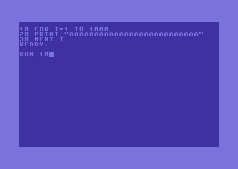Ordner schrieb: > Oder (auf nen C64) > > 10 FOR I=1 TO 1000 > 20 PRINT "A" > 30 NEXT I > > RUN 10 Nach meiner Autobatterie die zweitbeste Idee :-), dauert kaum 45 Sekunden...