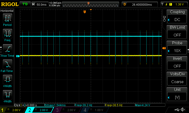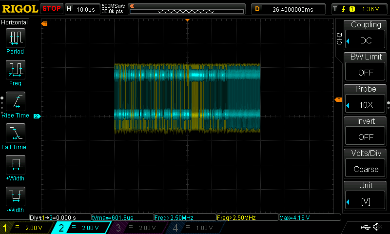 Hallo zusammen, ich habe mir mit dem Oszilloskop den SPI Verkehr zwischen einem MP3 Player und einer SD Karte angesehen. Folgendes ist mir aufgefallen: 1. CS wird nicht verwendet. Der Pin ist im SD Kartenslot nicht angeschlossen. 2. Das Clock-Signal (16 MHz) kommt vom Master immer in ungefähren 20ms Schüben (Bild 1) 3. Diese kurzen Sequenzen sind etwa 50-250 µS lang (Bild 2) 4. Das Clock-Signal enthält keine Pausen zwischen den Bytes und läuft innerhalb eines Schubes kontinuierlich durch (Bild 3). Es läuft auch weiter, wenn MOSI und MISO beide inaktiv sind (MOSI nicht im Bild, aber wirklich so) Wie erkennen Master und Slave dabei die Wörter? Ist das eine spezielle Unterart von SPI die mir bislang nicht untergekommen ist? Falls Jemand so einem Datenaustausch schon begegnet ist und mich klüger machen kann wäre das super. Danke Fabian
