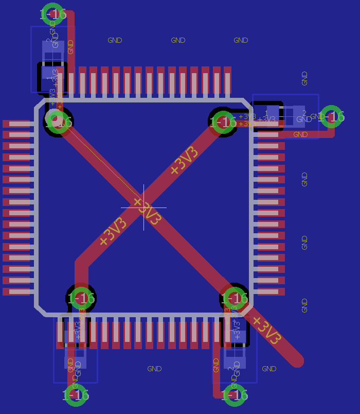 Ich hab das bei den großen Käfern (PIC32MZ, EP4CE10) bislang so gehandhabt: Top: VCC-Fläche unter Chipgehäuse, 1 Zuführung auf Toplayer durch die Ecke vom TQFP, dort nochmals separat abgeblockt gegen GND. Bottom: Durchgängie GND-Fläche, auch unter Chipgehäuse. Stubs vermeiden. Versorgungspins vom TQFP gehen nach innen weg, auf ein Via und auf der Unterseite dann unter dem Cip die 0805er platziert. Hat für mich den Vorteil, dass ich die Signale sauber wegrouten kann. Hab leider im Moment keinen Screenshot zur Hand. Konnte Mangels HF-Meßplatz nie EMV messen, aber es gab zumindest nie irgendwelche Fehlfunktionen.