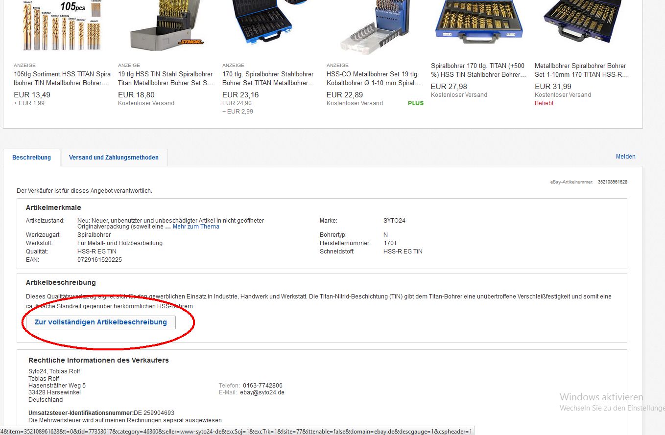 N'abend, wollte eben mal ein paar Sachen in der Bucht anschauen und evtl. kaufen. Aber was ist das nun wieder für ein Schwachsinn? Auf der üblichen Seite mit der Artikelbeschreibung soll ich nun -wollte ich mehr wissen- nun noch auf"Zur vollständigen Artikelbeschreibung" klicken (s. Bild). Danach öffnet sich ein weiteres Fenster zu diesem Artikel. Aber was soll dieser Schwachfug? IMMER will ich alles zu einem Artikel wissen und um auch vergleichen zu können, habe ich oft mehrere Fenster verschiedener Anbieter offen. Durch diesen Blödsinn wird es nun viel unübersichtlicher. Habt Ihr das auch ? Und kann man diese "tolle" Neuerung irgendwo abschalten? Trotzdem einen netten Abendgruss von Frank Ach so: Browser Firefox, OS = Win 10