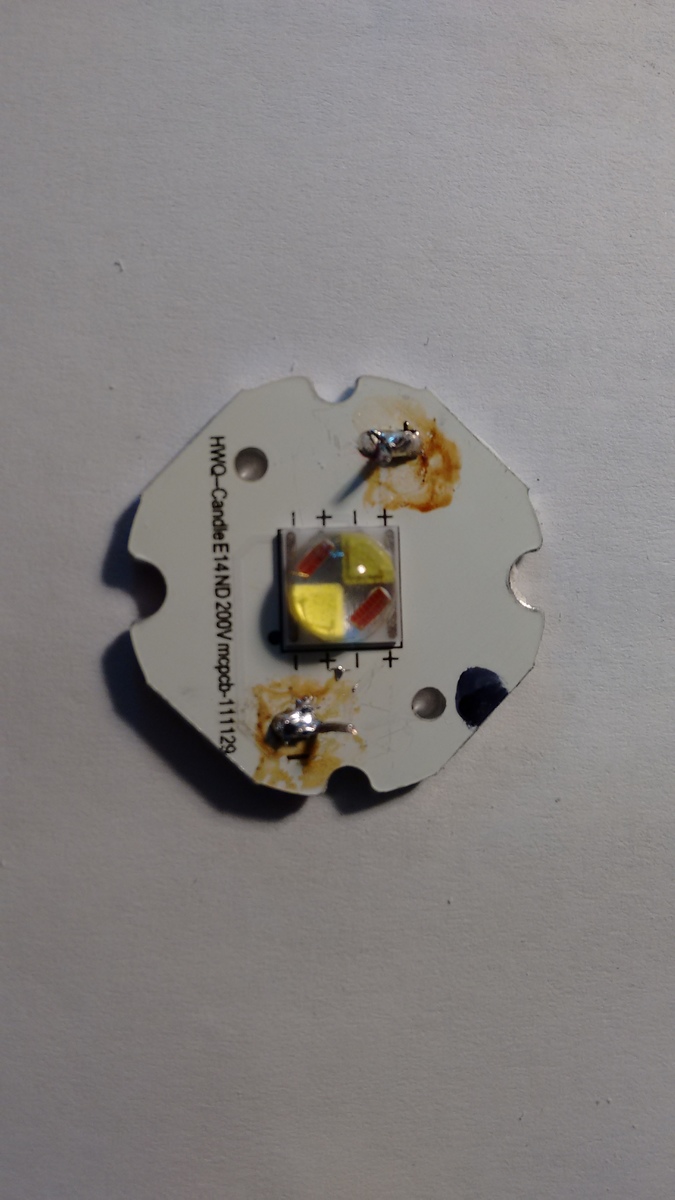 Ich habe eine LED-Lampe in Kerzenform zerlegt. Die LED hat eine seltsame Struktur: Zwei gegenüberliegende gelbe Ecken und in den anderen beiden Quadranten ein oranges Muster. Was ist das? Marcus