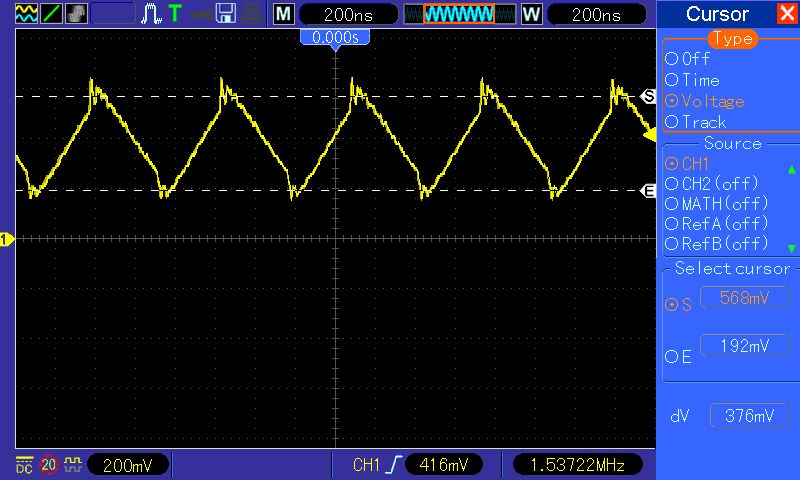 Christian S. schrieb: > Hallo, > > sehen wir da auf dem Bild ein Dreieck von 400mVss bei 1,5 MHz? Ist das > die Spannung über dem 2,2 Ohm Shunt? ja sind knapp 376mV Differenz zwischen den Peaks über dem shunt > Hast Du vielleicht den Spitzenwert des Stromes ausgerechnet und nicht > den Mittelwert?