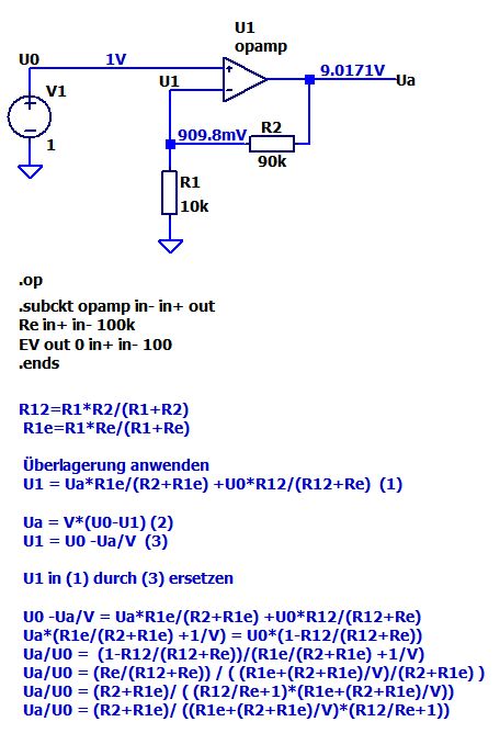 @Daniel, mit deiner Formel kommen exakt die gleichen Zahlenwerte heraus wie mit meiner Formel. Deshalb muss es möglich sein meine Formel in deine zu überführen. Ua/U0 = (R2+R1e)/ ((R1e+(R2+R1e)/V)*(R12/Re+1)) R12 = R1*R2/(R1+R2) R1e = R1*Re/(R1+Re) Deine Musterlösung: Ua/U0 = (1+R2/R1)/(1 + (1+ R2*(R1+Re)/(R1*Re))/V )