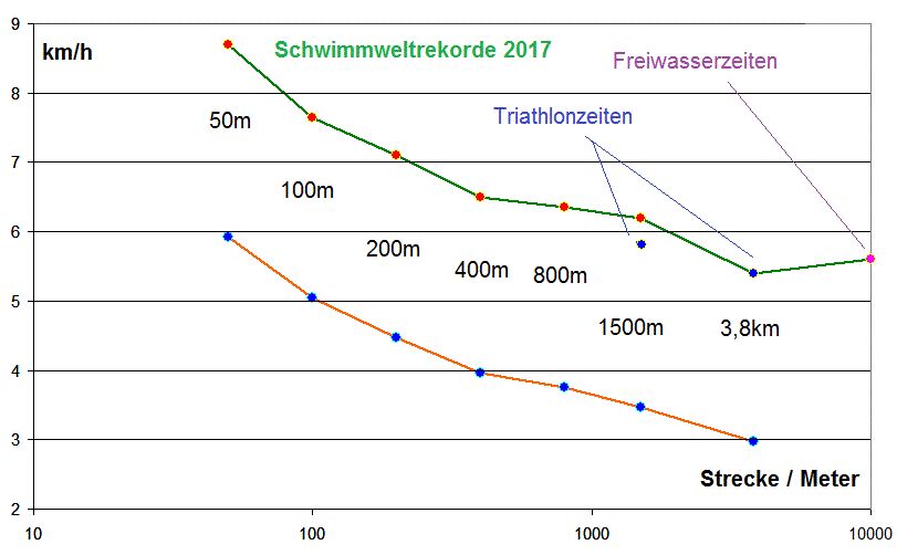 Immerhin habe ich nun folgende Zahlen zur Geschwindigkeit eines Profis gefunden: Kraul (Freistil) 2,13 m/s = 7,67 km/h Brasilien César Cielo