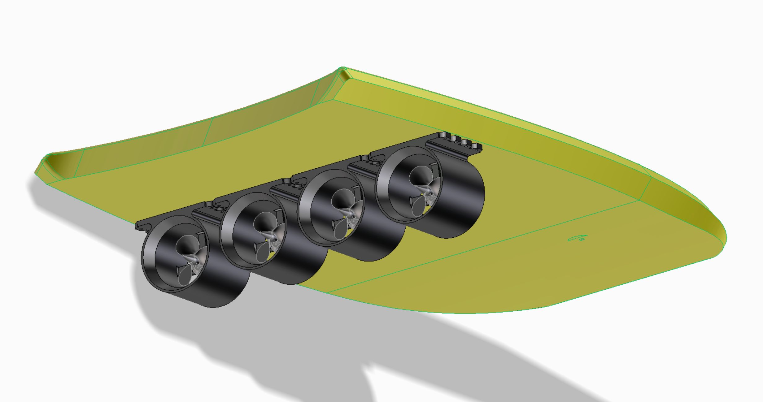 Nochmal danke für die Anregungen! Anbei mal der jetzige Konstruktionsstand. Der Antrieb setzt sich aus 4 Brushlessmotoren zusammen. Die Montagerohre werden ausgedruckt. Es fehlen noch die Brushlesstreiber, der Akku und die Ansteuerung und die wasserdichten Gehäuse...